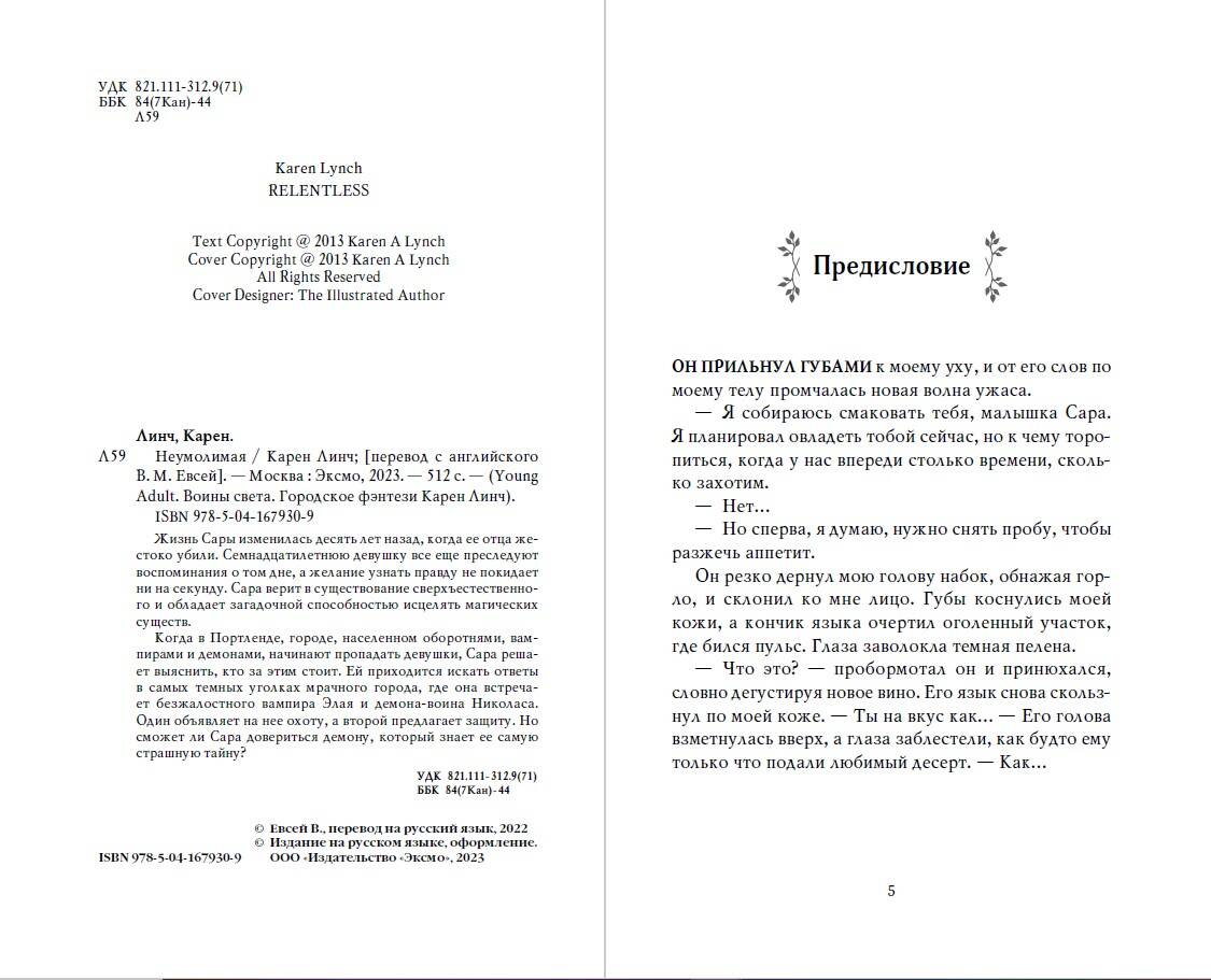 Жизнь Сары изменилась десять лет назад, когда ее отца жестоко убили. Семнадцатилетнюю девушку все еще преследуют воспоминания о том дне, а желание узнать правду не покидает ни на секунду. Сара верит в существование сверхъестественного и обладает загадочной способностью исцелять магических существ. Когда в Портленде, городе, населенном оборотнями, вампирами и демонами, начинают пропадать девушки, Сара решает выяснить, кто за этим стоит. Ей приходится искать ответы в самых темных уголках мрачного города, где она встречает безжалостного вампира Элая и демона-воина Николаса. Один объявляет на нее охоту, а второй предлагает защиту. Но сможет ли Сара довериться демону, который знает ее самую страшную тайну? Портленд - город тайн. В темных закоулках всегда можно наткнуться на вампиров или оборотней. Но Сару это не пугает, ведь ей давно о них известно, также как о гоблинах, фейри и тролле по имени Реми. Первая часть серии бестселлеров New York Times о девушке, жаждущей справедливости и пытающейся выжить в мире сверхъестественных сил. Сара - сильная, волевая девушка, открывшая в себе способности еще в раннем детстве. Сейчас ей приходится не только уничтожать вампиров и искать причастных к смерти ее отца, но и научится сдерживать своего внутреннего демона. Что знает Сара о своем происхождении? Кто были ее родители и неужели по венам девушки течет кровь демона? Она узнает про Мохири - полулюдей-полудемонов. Расу воинов, охотников на вампиров и тех, кто представляет угрозу для смертных. Роман попал в Топ-10 бестселлеров Amazon сразу в нескольких категориях: «Книги о вампирах для молодежи», «Книги темного фэнтези для молодежи», «Современное фэнтези для молодежи». Для всех фанатов сериала «Баффи - истребительница вампиров», сильных и независимых героинь, чьи сердца полны отваги и решимости. Роман опубликован на пяти языках.| Издательство | ООО "Издательство "Эксмо" |