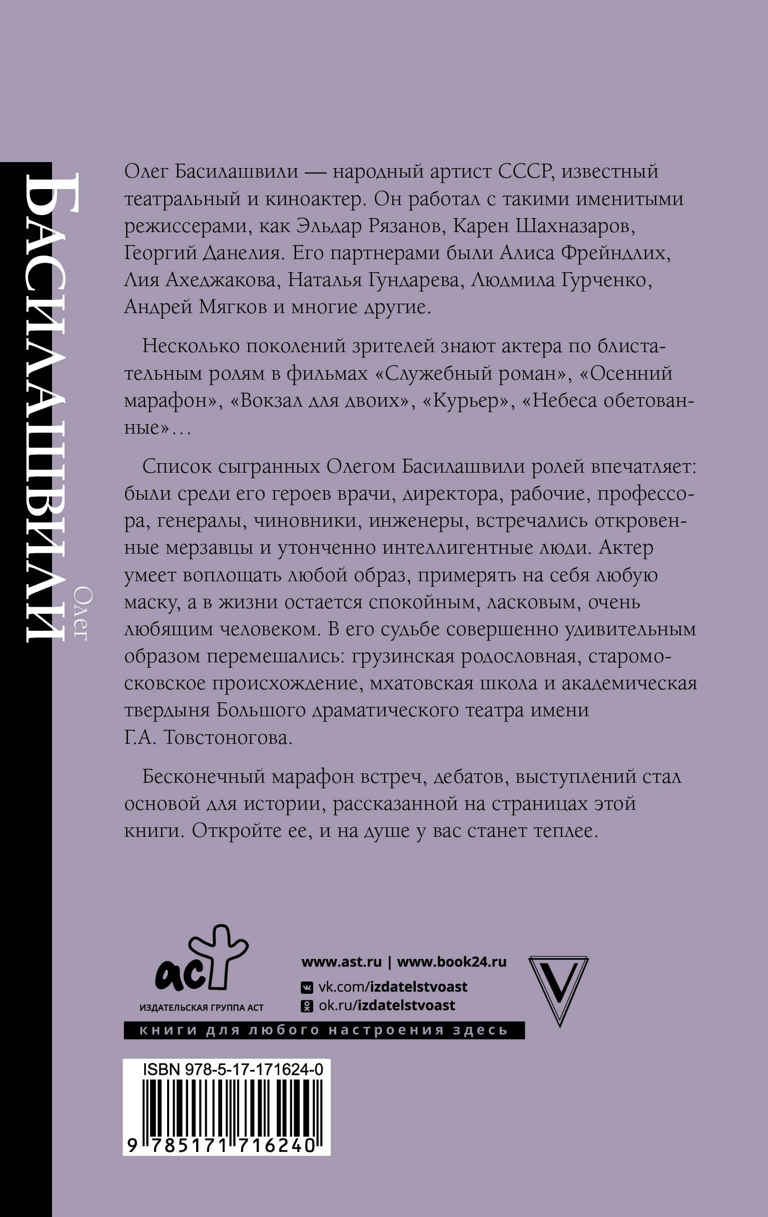 Олег Басилашвили - народный артист СССР, известный театральный и киноактер. Он работал с такими именитыми режиссерами, как Эльдар Рязанов, Карен Шахназаров, Георгий Данелия. Его партнерами были Алиса Фрейндлих, Лия Ахеджакова, Наталья Гундарева, Людмила Гурченко, Андрей Мягков и многие другие. Несколько поколений зрителей знают актера по блистательным ролям в фильмах "Служебный роман", "Осенний марафон", "Вокзал для двоих", "Курьер", "Небеса обетованные"… Список сыгранных Олегом Басилашвили ролей впечатляет: были среди его героев врачи, директора, рабочие, профессора, генералы, чиновники, инженеры, встречались откровенные мерзавцы и утонченно интеллигентные люди. Актер умеет воплощать любой образ, примерять на себя любую маску, а в жизни остается спокойным, ласковым, очень любящим человеком. В его судьбе совершенно удивительным образом перемешались: грузинская родословная, старомосковское происхождение, мхатовская школа и академическая твердыня Большого драматического театра имени Г.А. Товстоногова. Бесконечный марафон встреч, дебатов, выступлений стал основой для истории, рассказанной на страницах этой книги. Откройте ее, и на душе у вас станет теплее.| Издательство | Издательство "АСТ" |