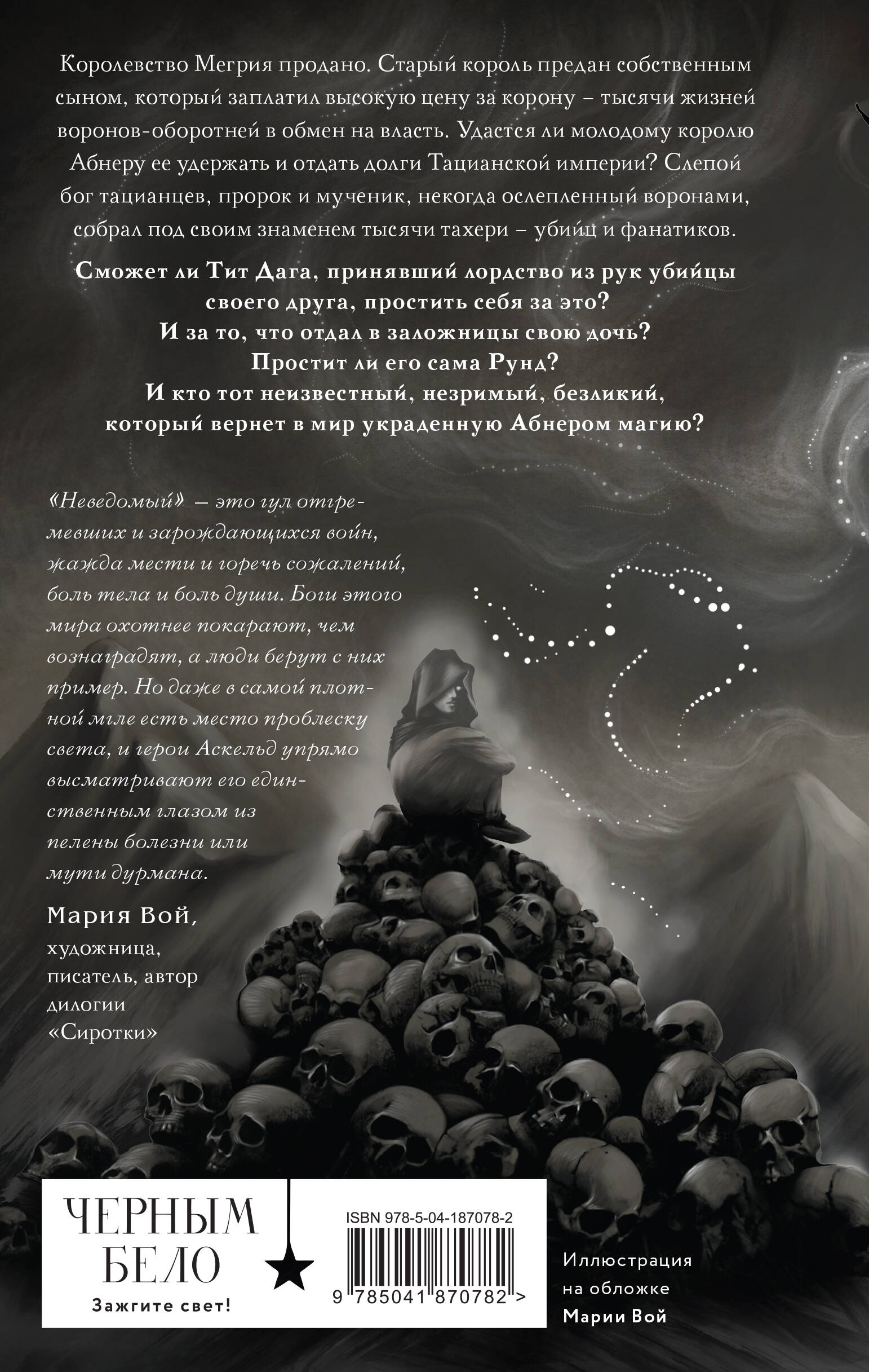 Королевство Мегрия продано. Старый король предан собственным сыном, который заплатил высокую цену за корону, - тысячи жизней воронов-оборотней в обмен на власть. Удастся ли молодому королю Абнеру ее удержать и отдать долги Тацианской империи? Слепой бог тацианцев, пророк и мученик, некогда ослепленный воронами, собрал под своим знаменем тысячи тахери - убийц и фанатиков. Сможет ли Тит Дага, принявший лордство из рук убийцы своего друга, простить себя за это? И за то, что отдал в заложницы свою дочь? Простит ли его сама Рунд? И кто тот неизвестный, незримый, безликий, который вернет в мир украденную Абнером магию? Мегрия стоит на пороге раскола и новой войны. Сделает она шаг вперед или отступится? Первая часть мрачной дилогии «Неведомый» в редком жанре гримдарк. История о человеческом предательстве, стремлении к справедливости, интригах и неоднозначных поступках. О событиях романа расскажут несколько центральных персонажей: четыре героя, четыре линии. Сюжет вдохновлен датской мифологией. Обложку для книги нарисовала Мария Вой.| Издательство | ООО "Издательство "Эксмо" |