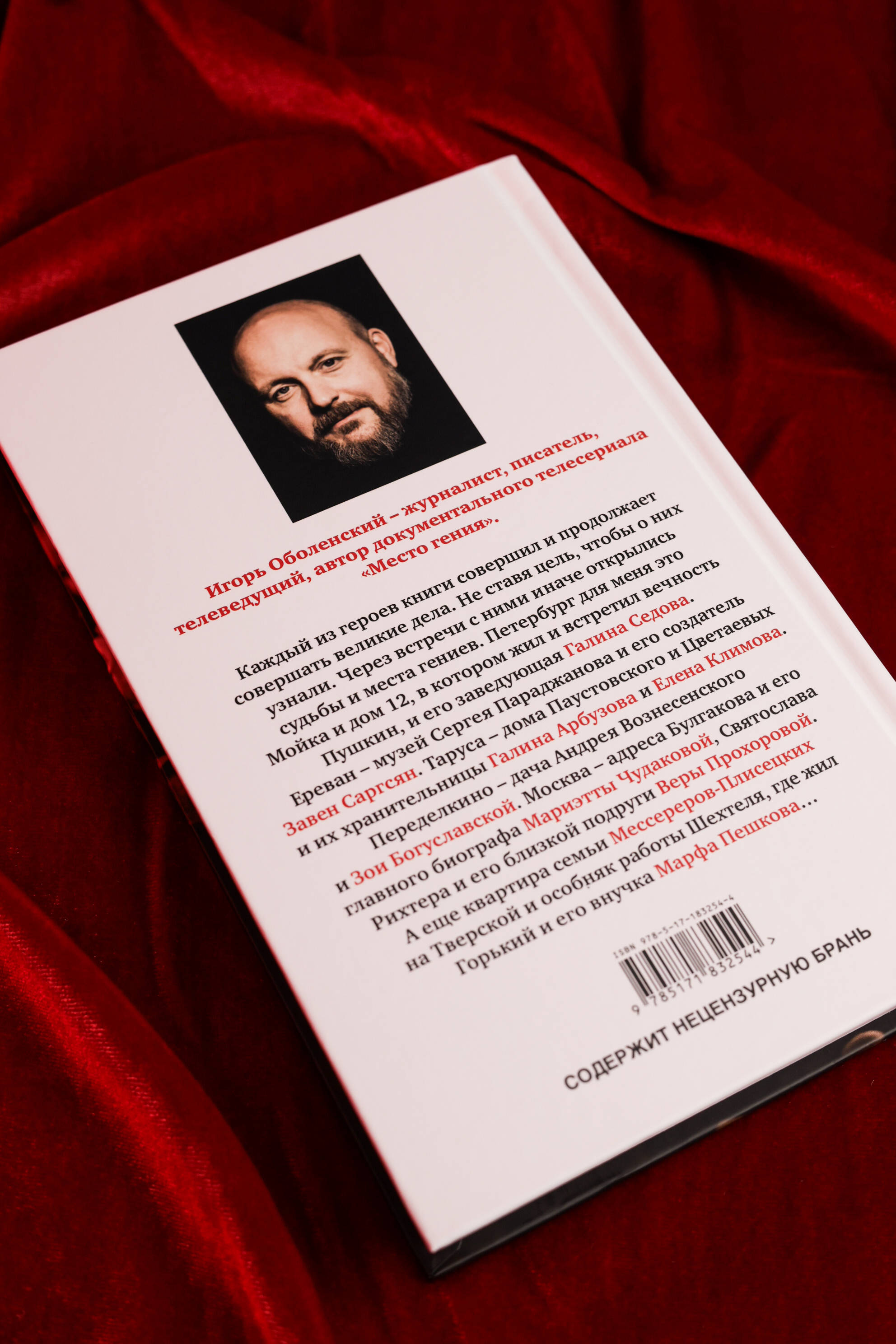 Игорь Оболенский - журналист, писатель, телеведущий, автор документального телесериала "Место гения". "Каждый из героев книги совершил и продолжает совершать великие дела. Не ставя цель, чтобы о них узнали. Через встречи с ними иначе открылись судьбы и места гениев. Петербург для меня это улица Мойка и дом 12, в котором жил и встретил вечность Пушкин, и его заведующая Галина Седова. Ереван - музей Сергея Параджанова и его создатель Завен Саргсян. Таруса - дома Паустовского и Цветаевых и их хранительницы Галина Арбузова и Елена Климова. Кисловодск - особняки, уцелевшие благодаря Борису Розенфельду. Переделкино - дача Андрея Вознесенского и Зои Богуславской. Ташкент - Малик Каюмов, участник вскрытия гробницы Тамерлана. Москва - адреса Булгакова и его главного биографа Мариэтты Чудаковой, Маяковского и Александра Ушакова, Святослава Рихтера и его близкой подруги Веры Прохоровой, квартира Мессереров-Плисецких на Тверской и особняк работы Шехтеля, где жил Горький и его внучка Марфа Пешкова…" (Игорь Оболенский).| Издательство | Издательство "АСТ" |