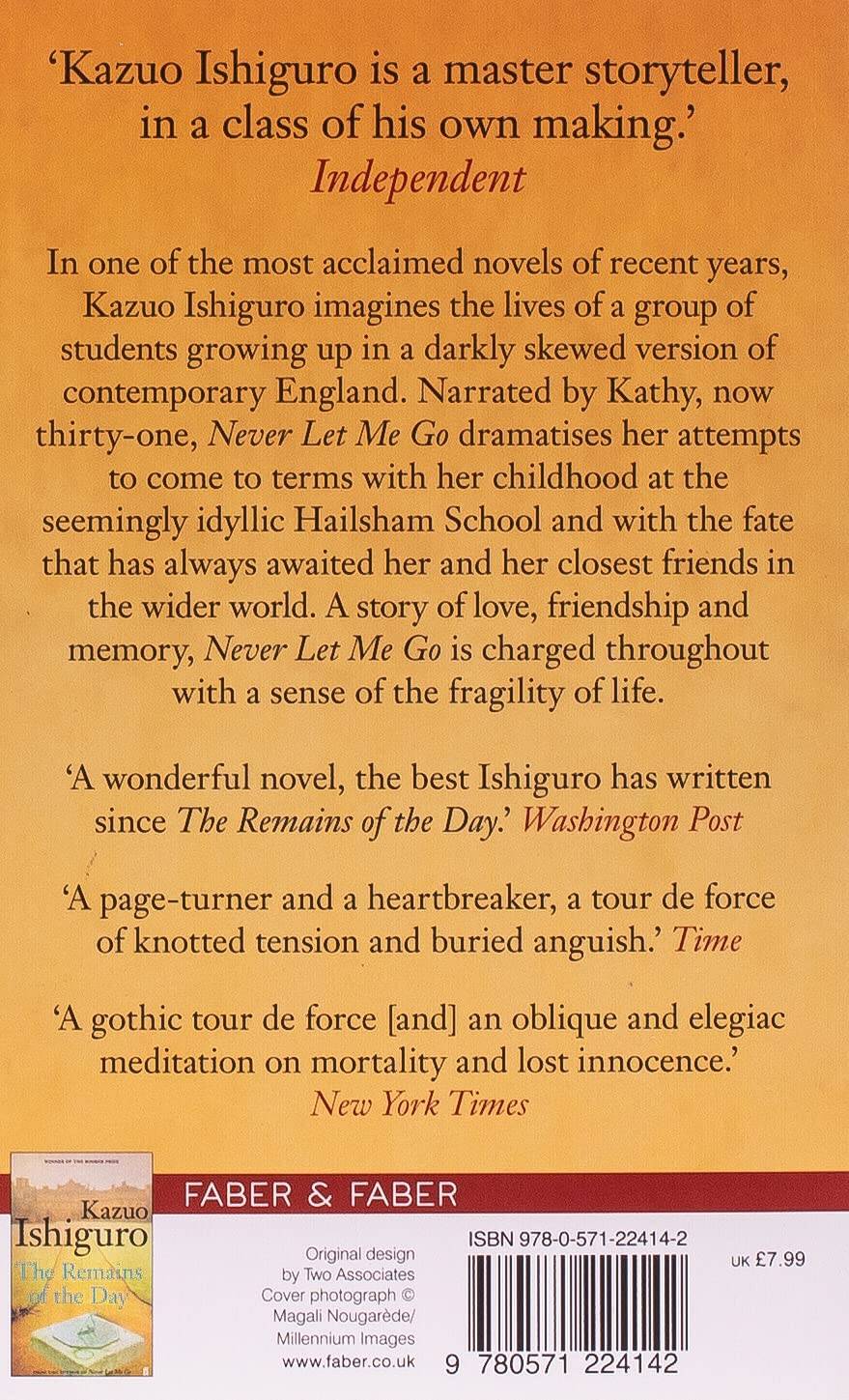 Never Let Me Go (Kazuo Ishiguro) Kathy, Ruth and Tommy were pupils at Hailsham - an idyllic establishment situated deep in the English countryside. The children there were tenderly sheltered from the outside world, brought up to believe they were special, and that their personal welfare was crucial. But for what reason were they really there?It is only years later that Kathy, now aged 31, finally allows herself to yield to the pull of memory and try to make sense of the past. What unfolds is an extraordinarily powerful story in which Kathy, Ruth and Tommy slowly come to realise that it is their seemingly happy childhood that has haunted them ever since, even tainting their adult lives. Part love story, part mystery, Never Let Me Go is a uniquely beautiful and troubling novel, charged throughout with a profound emotional depth. Не отпускай меня (Кадзуо Исигуро) Кэти, Рут и Томми учились в Хейлшеме - идиллическом учебном заведении, расположенном в глубине английской сельской местности. Там детей бережно оберегали от внешнего мира, воспитывали в вере, что они особенные и что их личное благополучие имеет решающее значение. Но по какой причине они были там на самом деле?Лишь годы спустя Кэти, которой сейчас 31 год, наконец позволяет себе поддаться зову памяти и попытаться осмыслить прошлое. Перед нами разворачивается необычайно яркая история, в которой Кэти, Рут и Томми постепенно приходят к пониманию того, что именно их, казалось бы, счастливое детство преследует их с тех пор и даже омрачает их взрослую жизнь. "Никогда не отпускай меня", отчасти история любви, отчасти тайна, - это необычайно красивый и тревожный роман, наполненный глубоким чувством.| Издательство | Faber and Faber |