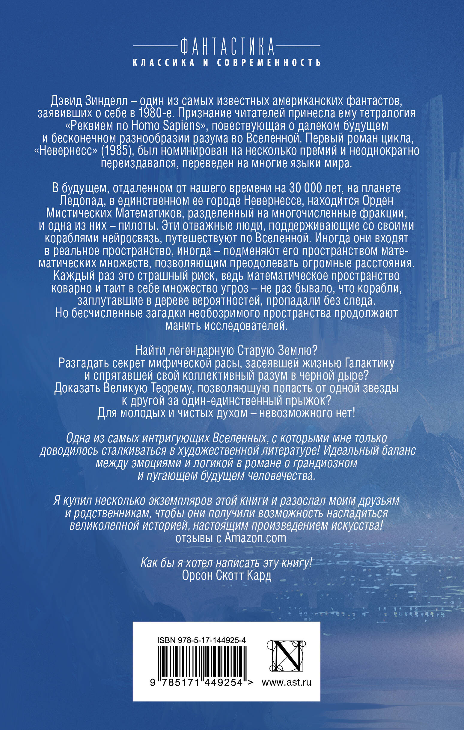 Дэвид Зинделл - один из самых известных американских фантастов, заявивших о себе в 1980-е. Признание читателей принесла ему тетралогия "Реквием по Homo Sapiens", повествующая о далеком будущем и бесконечном разнообразии разума во Вселенной. Первый роман цикла, "Невернесс" (1985), был номинирован на несколько премий и неоднократно переиздавался, переведен на многие языки мира. В будущем, отдаленном от нашего времени на 30000 лет, на планете Ледопад, в единственном ее городе Невернессе, находится Орден Мистических Математиков, разделенный на многочисленные фракции, и одна из них - пилоты. Эти отважные люди, поддерживающие со своими кораблями нейросвязь, путешествуют по Вселенной. Иногда они входят в реальное пространство, иногда - подменяют его пространством математических множеств, позволяющим преодолевать огромные расстояния. Каждый раз это страшный риск, ведь математическое пространство коварно и таит в себе множество угроз - не раз бывало, что корабли, заплутавшие в дереве вероятностей, пропадали без следа. Но бесчисленные загадки необозримого пространства продолжают манить исследователей. Найти легендарную Старую Землю? Разгадать секрет мифической расы, засеявшей жизнью Галактику и спрятавшей свой коллективный разум в черной дыре? Доказать Великую Теорему, позволяющую попасть от одной звезды к другой за один-единственный прыжок? Для молодых и чистых духом - невозможного нет!| Издательство | Издательство "АСТ" |