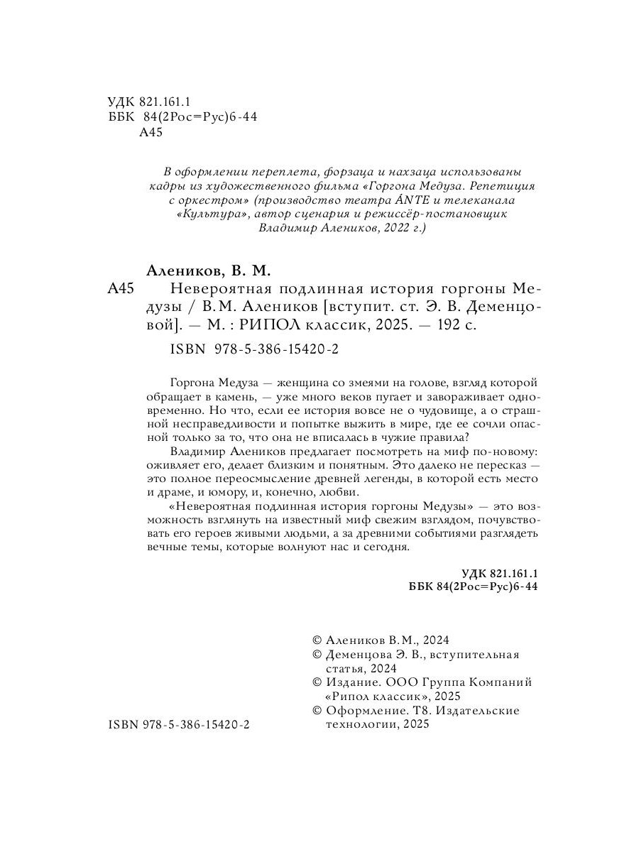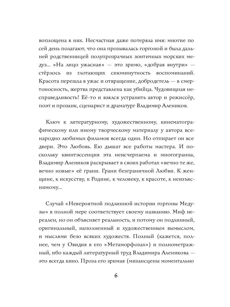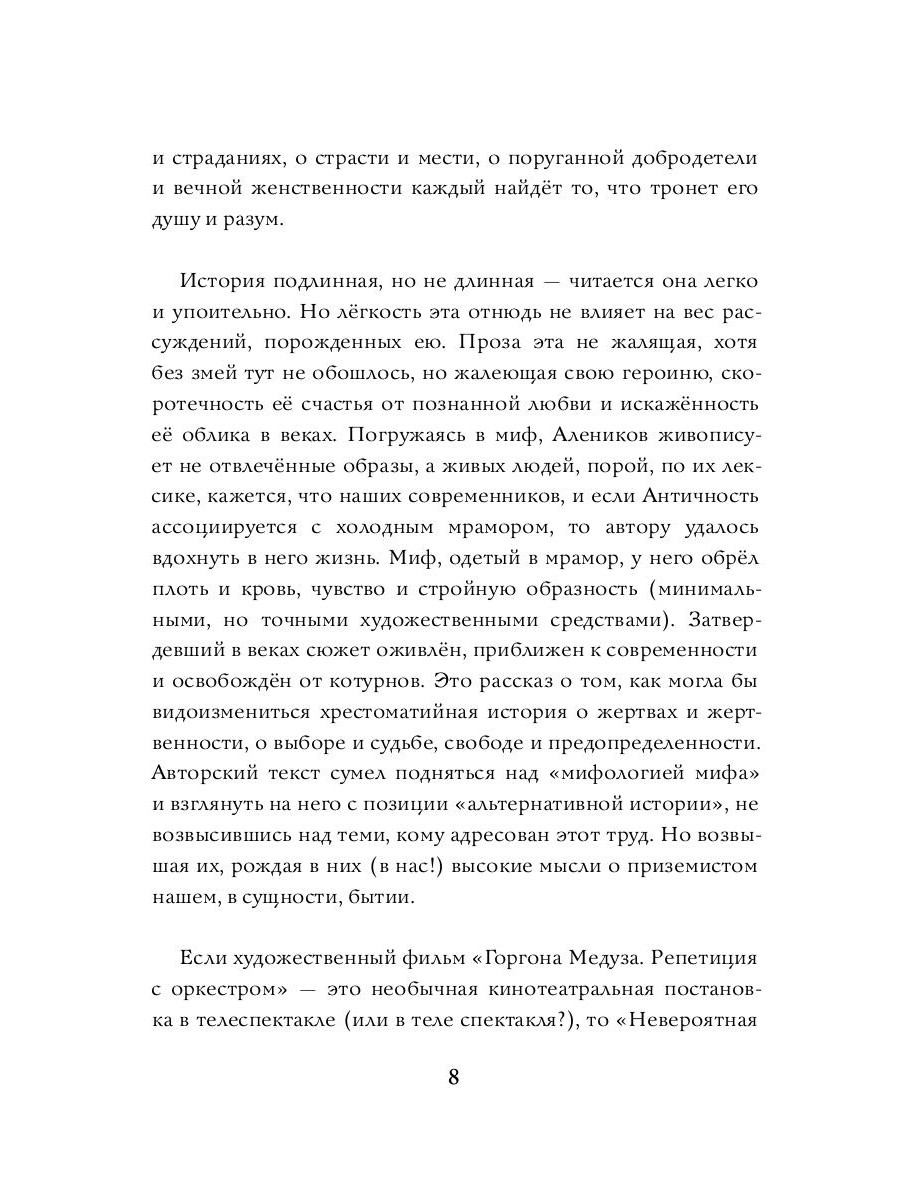 Горгона Медуза - женщина со змеями на голове, взгляд которой обращает в камень, -- уже много веков пугает и завораживает одновременно. Но что, если ее история вовсе не о чудовище, а о страшной несправедливости и попытке выжить в мире, где ее сочли опасной только за то, что она не вписалась в чужие правила? Владимир Алеников предлагает посмотреть на миф по-новому: оживляет его, делает близким и понятным. Это далеко не пересказ - это полное переосмысление древней легенды, в которой есть место и драме, и юмору, и, конечно, любви. «Невероятная подлинная история горгоны Медузы» - это возможность взглянуть на известный миф свежим взглядом, почувствовать его героев живыми людьми, а за древними событиями разглядеть вечные темы, которые волнуют нас и сегодня.| Издательство | Рипол Классик |