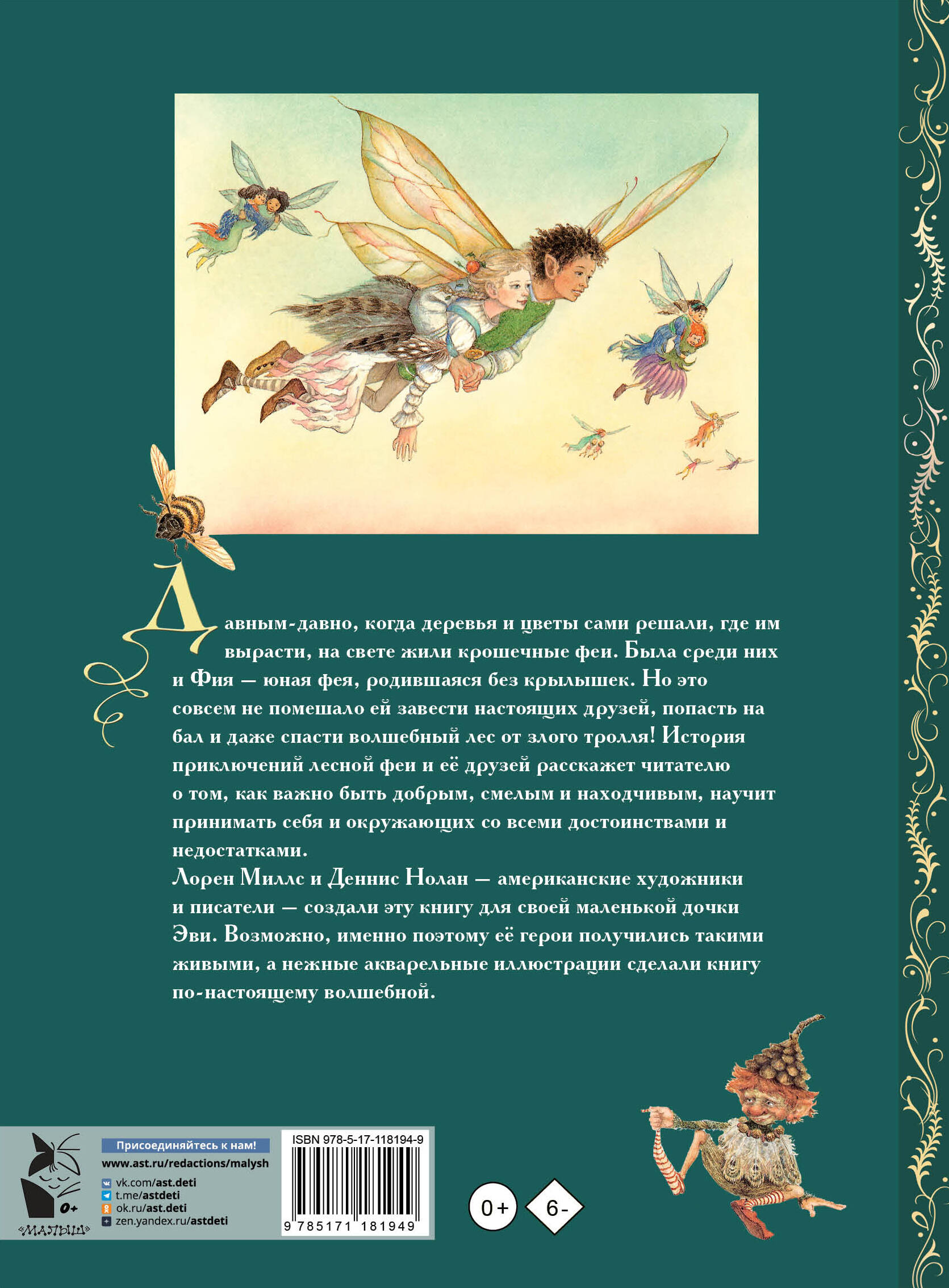 Давным-давно, когда деревья и цветы сами решали, где им вырасти, на свете жили крошечные феи. Была среди них и Фия - юная фея, родившаяся без крылышек. Но это совсем не помешало ей завести настоящих друзей, попасть на бал и даже спасти волшебный лес от злого тролля! История приключений лесной феи и её друзей расскажет читателю о том, как важно быть добрым, смелым и находчивым, научит принимать себя и окружающих со всеми достоинствами и недостатками. Лорен Миллс и Деннис Нолан - американские художники и писатели - создали эту книгу для своей маленькой дочки Эви. Возможно, именно поэтому её герои получились такими живыми; а замечательный перевод Маши Лукашкиной и нежные акварельные иллюстрации сделали книгу по-настоящему волшебной.| Издательство | ИЗДАТЕЛЬСТВО "АСТ" |