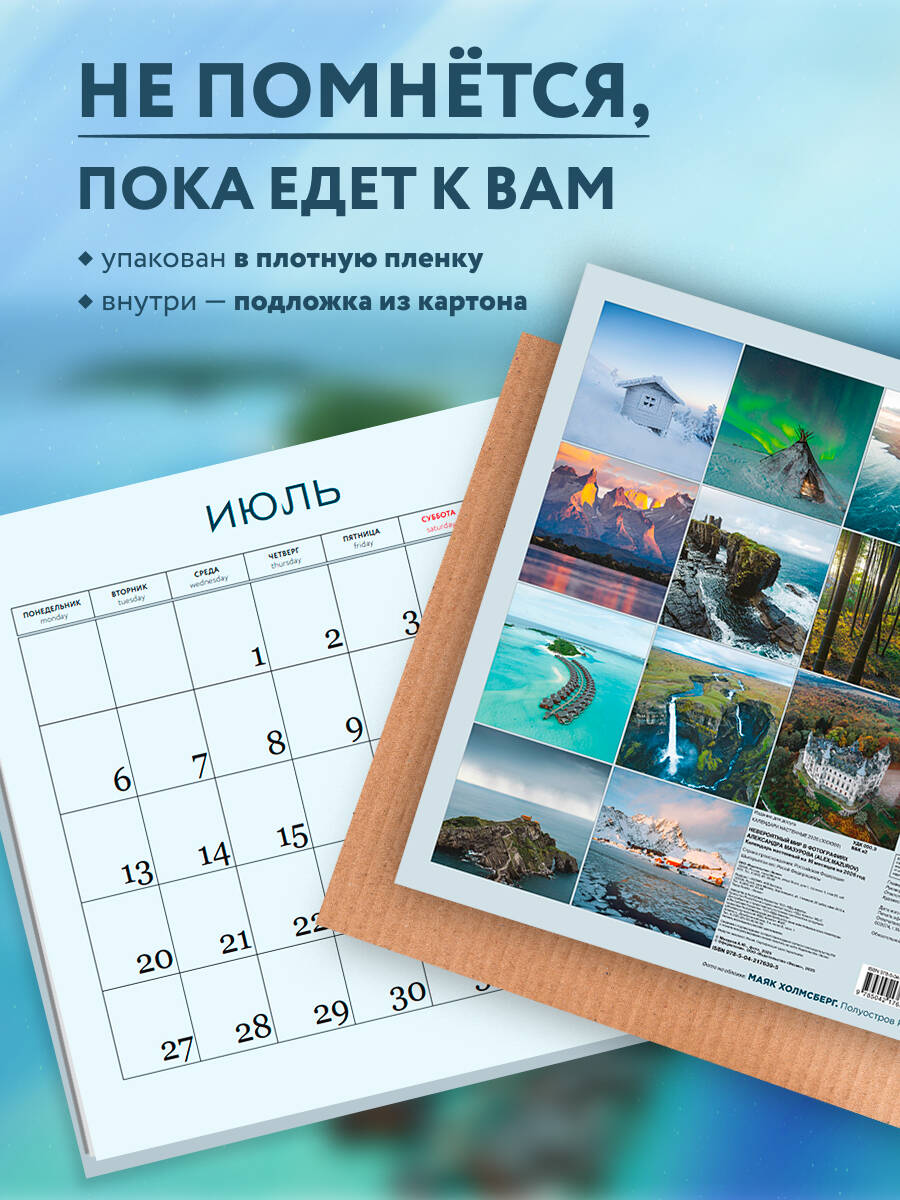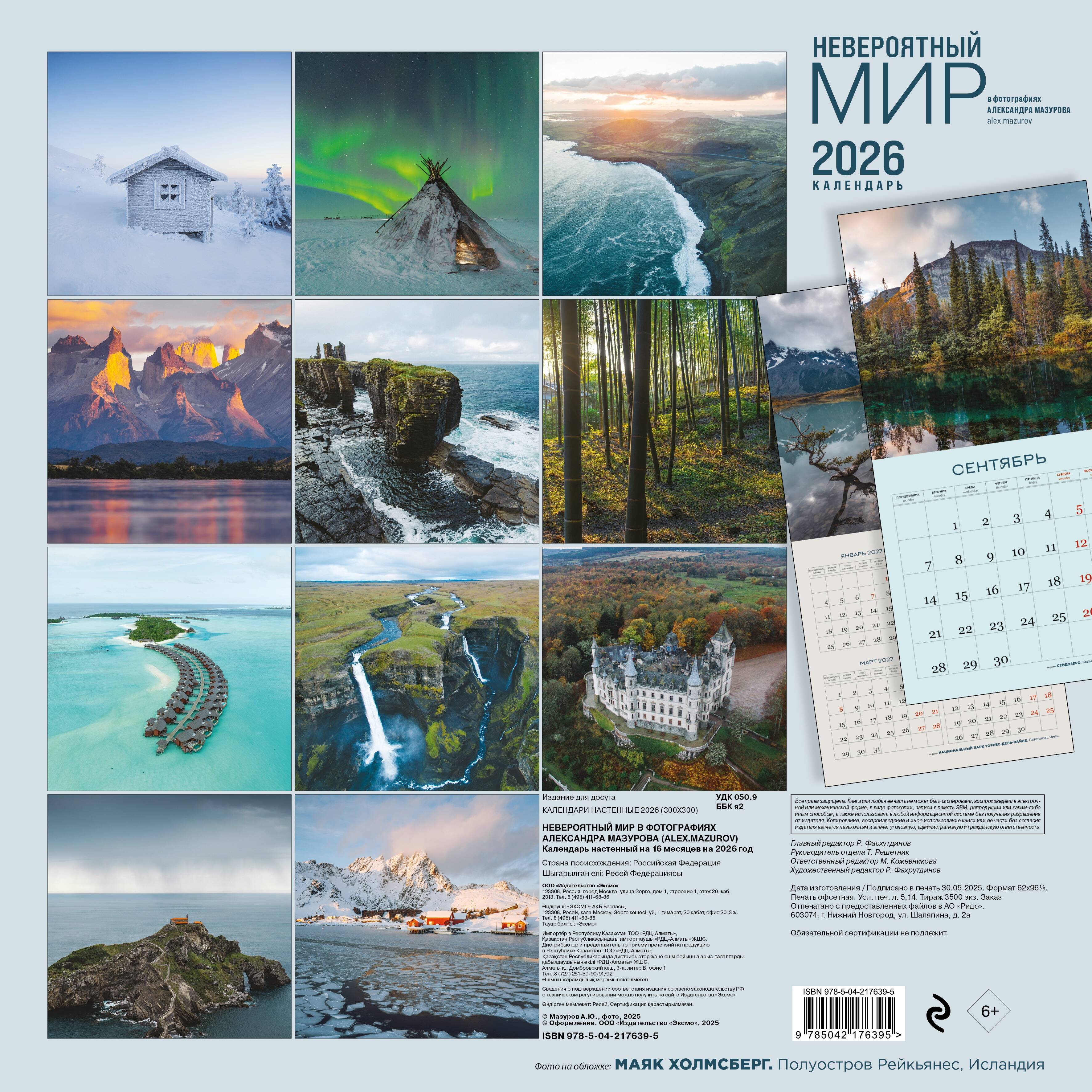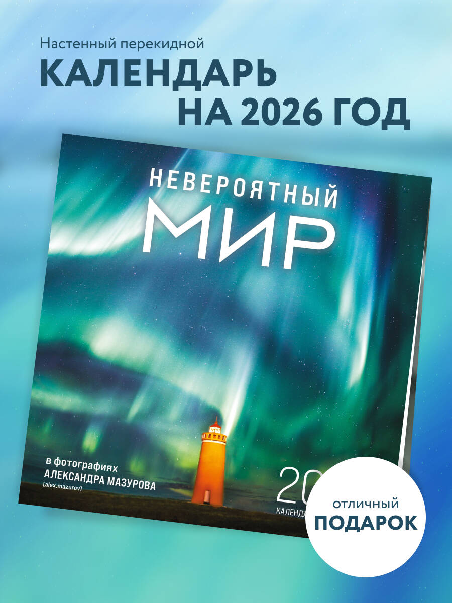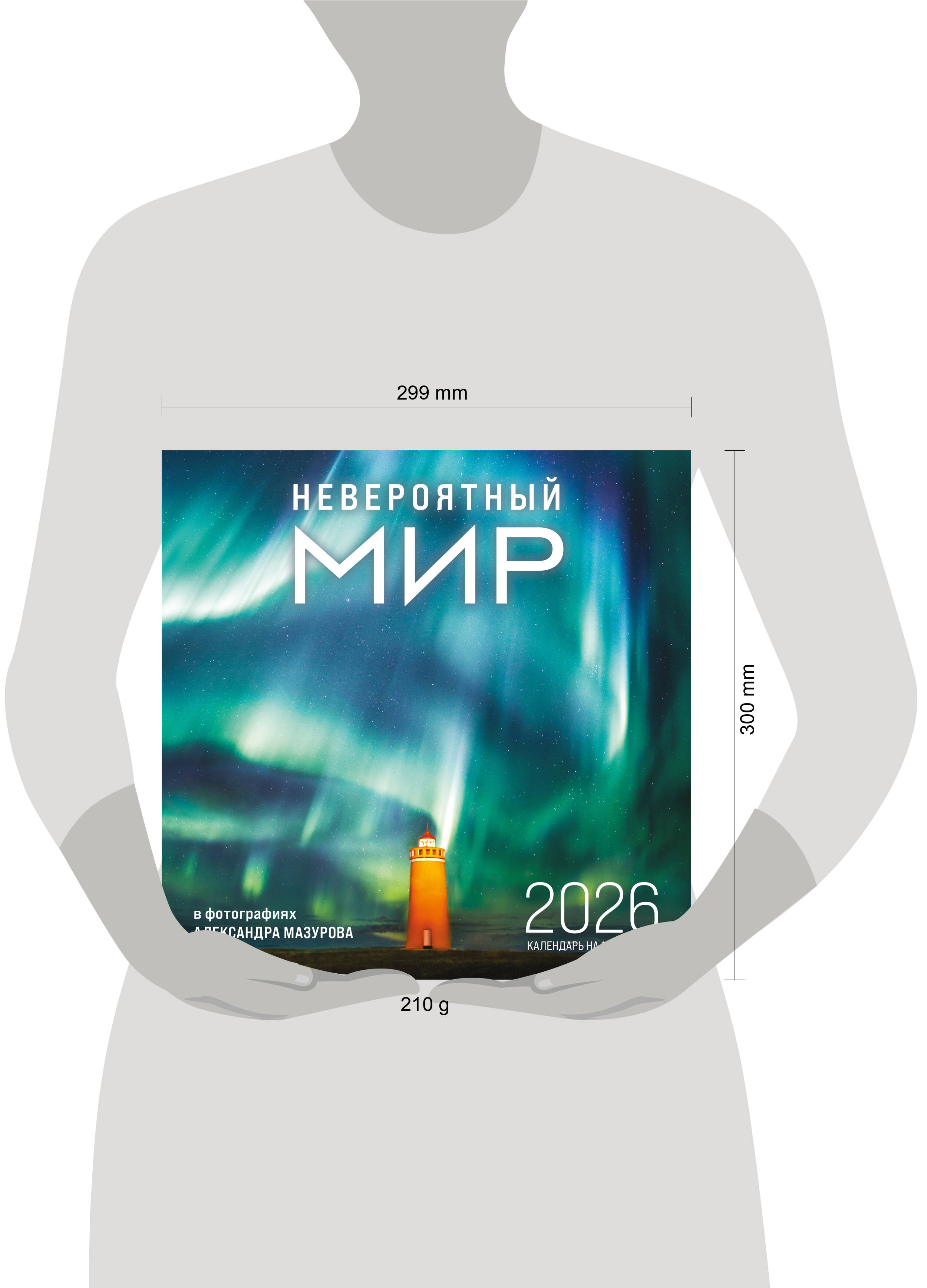 О серии: Наши настенные календари отличаются высоким качеством исполнения! Тщательно подобранные иллюстрации, напечатанные на глянцевой бумаге высочайшего качества, станут настоящим украшением дома, а в календарной сетке найдется место для ваших планов: большие клетки позволят делать записи и организовать свой год! В календаре также отмечены все государственные праздники. В серии настенных календарей издательства «ЭКСМО» каждый найдет тему по вкусу: великие художники, великолепные подборки с самыми знаменитыми произведениями искусства, легендарные кинематографические саги и игры, главные книжные авторы и бестселлеры, фотографии и иллюстрации любимых животных и многое-многое другое! О календаре: В календаре «Невероятный мир» известный фотограф Александр Мазуров решил собрать самые красивые и атмосферные места мира, в которых он когда-либо бывал. Бескрайние просторы России, бирюзовые воды Мальдив, готические замки Шотландии, бесчисленные водопады Исландии, величественные горы Чили и захватывающее северное сияние в Норвегии - все это и многое другое ждет вас на страницах календаря! Также в календарь включен дополнительный разворот с первыми четырьмя месяцами 2027 года! Для кого: Невероятные фотографии удивительных мест нашей планеты для любителей путешествий и мечтателей. Технические параметры: - Тип календаря - настенный перекидной. - Год - 2026. - Календарная сетка - с разбивкой по месяцам. - Вид скрепления - скрепка. - Ширина - 30 см. - Высота - 30 см. - Внутренний блок - мелованная бумага 130 г/м2. - Подложка - плотный гофрокартон для поддержания формы. - Индивидуальная упаковка в плотный целлофановый пакет.| Издательство | ООО "Издательство "Эксмо" |
