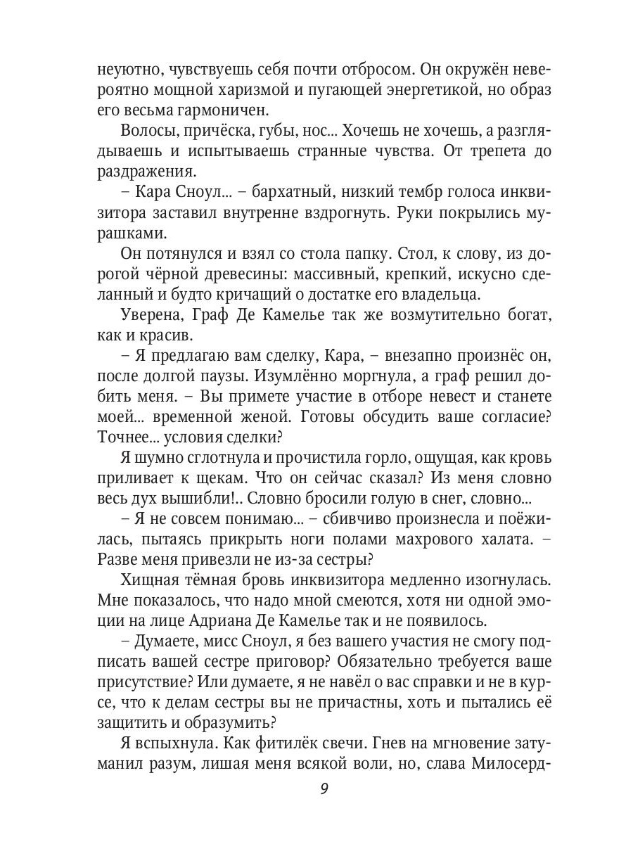 Сделка между ведьмой и инквизитором - что может быть проще? Я хочу спасти сестру от плахи, он - избавиться от навязанного императором брака. Всего-то нужно победить в отборе невест, стать его фиктивной женой, а после - получить достойное вознаграждение и…скоропостижно «скончаться». Я четко придерживалась плана, но победить в отборе не так просто. Тяжелый характер моего «жениха» только усложняет задачу, а вместо мыслей о свободе в голове единственное желание… Убить инквизитора!| Издательство | Т8 RUGRAM |
