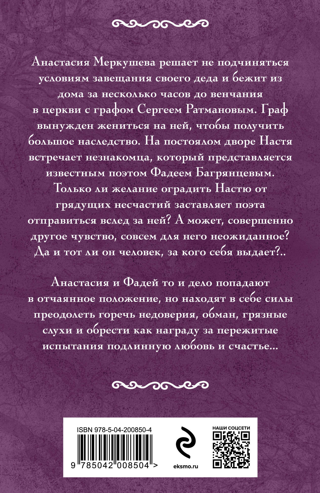 Анастасия Меркушева решает не подчиняться условиям завещания своего деда и бежит из дома за несколько часов до венчания в церкви с графом Сергеем Ратмановым. Граф вынужден жениться на ней, чтобы получить большое наследство. На постоялом дворе Настя встречает незнакомца, который представляется известным поэтом Фадеем Багрянцевым. Только ли желание оградить Настю от грядущих несчастий заставляет поэта отправится вслед за ней, а, может, совершенно другое чувство, совсем для него неожиданное? Да и тот ли он человек, за кого себя выдает?.. Анастасия и Фадей то и дело попадают в отчаянное положение, но находят в себе силы преодолеть горечь недоверия, обман, грязные слухи и обрести, как награду за пережитые испытания, подлинную любовь и счастье...| Издательство | ООО "Издательство "Эксмо" |