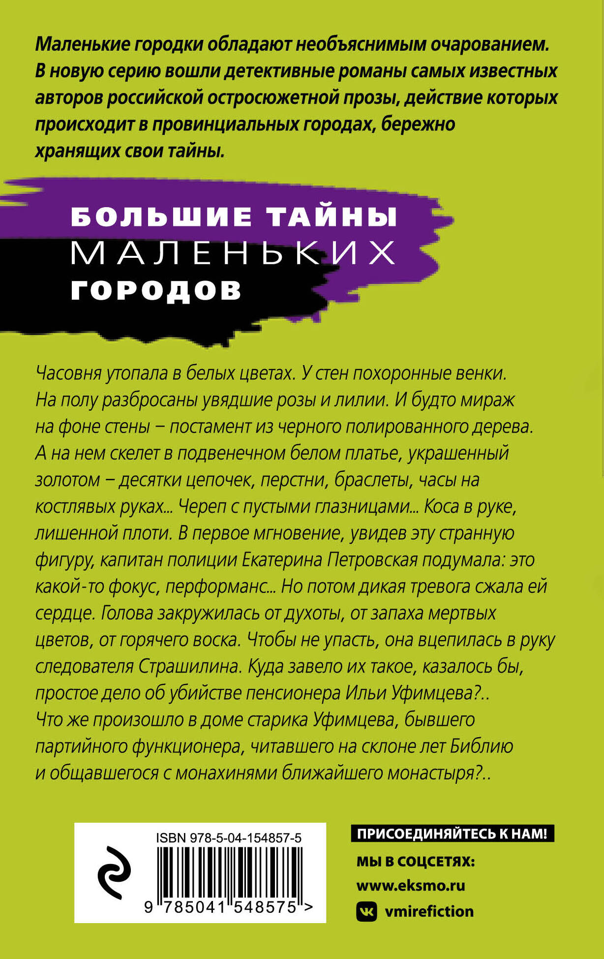 Часовня утопала в белых цветах. У стен похоронные венки. На полу разбросаны увядшие розы и лилии. И будто мираж на фоне стены, постамент из черного полированного дерева. А на нем скелет в подвенечном белом платье, украшенный золотом - десятки цепочек, перстни, браслеты, часы на костлявых руках… Череп с пустыми глазницами… Коса в руке, лишенной плоти. В первое мгновение, увидев эту странную фигуру, капитан полиции Екатерина Петровская подумала: это какой-то фокус, перформанс… Но потом дикая тревога сжала ей сердце. Голова закружилась от духоты, от запаха мертвых цветов, от горячего воска. Чтобы не упасть, она вцепилась в руку следователя Страшилина. Куда завело их такое, казалось бы, простое дело об убийстве пенсионера Ильи Уфимцева?.. Что же произошло в доме старика Уфимцева, бывшего партийного функционера, читавшего на склоне лет Библию и общавшегося с монахинями ближайшего монастыря?.. Романы потомственного следователя Татьяны Степановой позволяют читателю побывать в литературной «комнате страха». Таинственные убийства, почти осязаемая атмосфера преступления, томительное и тревожное ожидание чего-то неведомого, пугающего... Все это Татьяне Степановой удается воспроизвести просто блестяще. Случайные встречи, повседневные дела, незначительные детали изображаются в ее детективах в каком-то особом, драматическом свете, словно безобидный весенний луг перед стремительно надвигающейся грозой.| Издательство | ООО "Издательство "Эксмо" |