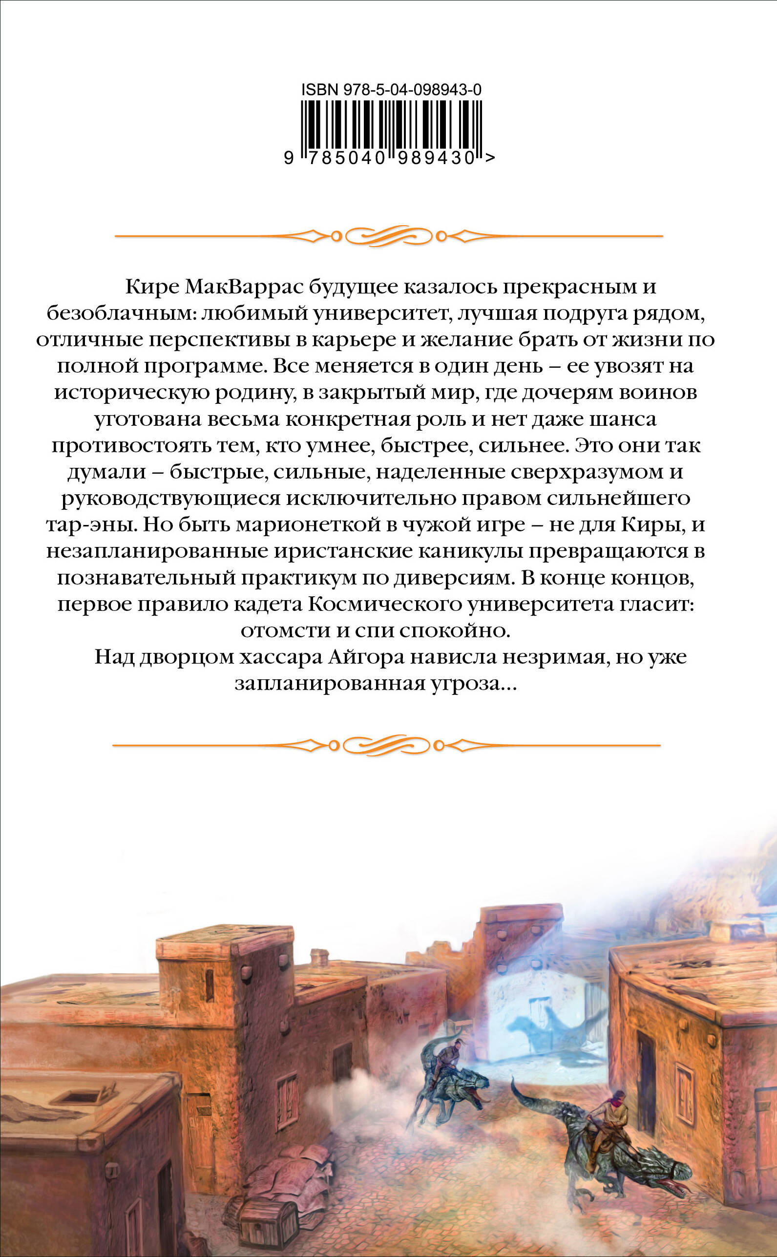 Кире МакВаррас будущее казалось прекрасным и безоблачным: любимый университет, лучшая подруга рядом, отличные перспективы в карьере и желание брать от жизни по полной программе. Все меняется в один день - ее увозят на историческую родину, в закрытый мир, где дочерям воинов уготована весьма конкретная роль и нет даже шанса противостоять тем, кто умнее, быстрее, сильнее. Это они так думали - быстрые, сильные, наделенные сверхразумом и руководствующиеся исключительно правом сильнейшего тар-эны. Но быть марионеткой в чужой игре - не для Киры, и незапланированные иристанские каникулы превращаются в познавательный практикум по диверсиям. В конце концов, первое правило кадета Космического университета гласит: отомсти и спи спокойно. Над дворцом хассара Айгора нависла незримая, но уже запланированная угроза…| Издательство | ООО "Издательство "Эксмо" |