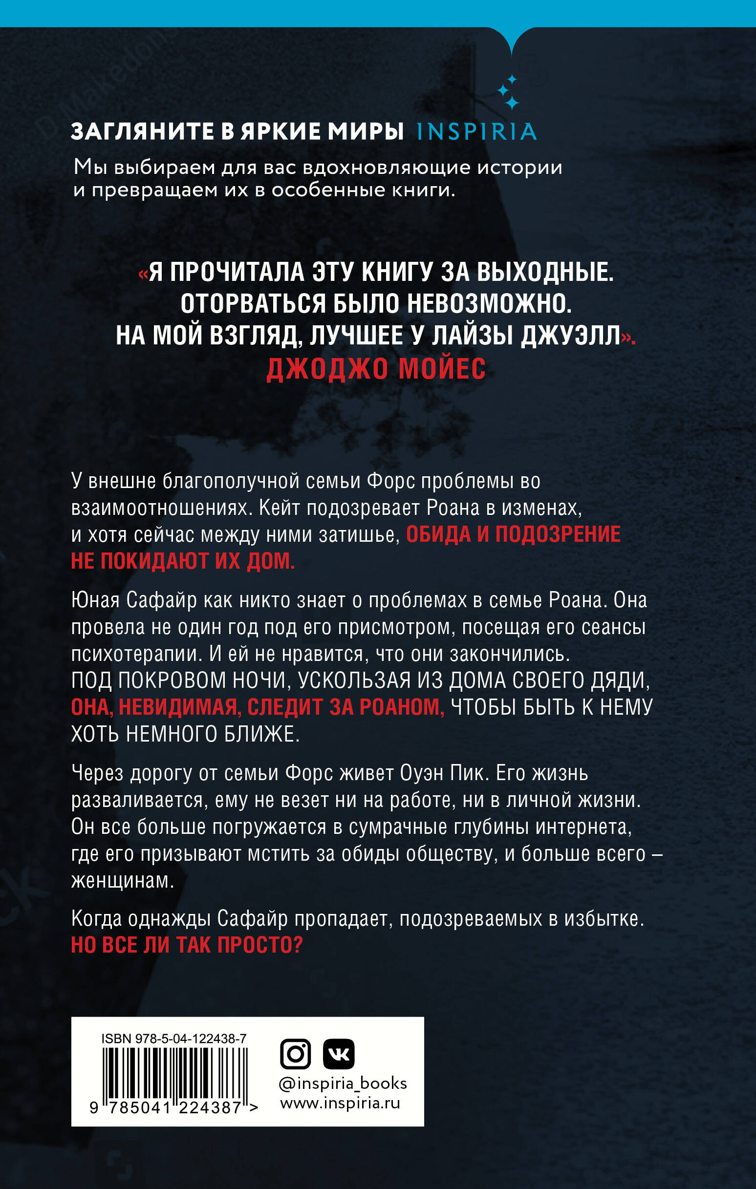 У внешне благополучной семьи Форс проблемы во взаимоотношениях. Кейт подозревает Роана в изменах, и хотя сейчас между ними затишье, обида и подозрение не покидают их дом. Юная Сафайр как никто знает о проблемах в семье Роана. Она провела не один год под его присмотром, посещая его сеансы психотерапии. И ей не нравится, что они закончились. Под покровом ночи, ускользая из дома своего дяди, она, невидимая, следит за Роаном, чтобы быть к нему хоть немного ближе. Через дорогу от семьи Форс живет Оуэн Пик. Его жизнь разваливается, ему не везет ни на работе, ни в личной жизни. Он все больше погружается в сумрачные глубины интернета, где его призывают мстить за обиды обществу, и больше всего - женщинам. Когда однажды Сайфер пропадает, подозреваемых в избытке. Но все ли так просто? «Мрачный, тщательно продуманный триллер, чье украшение - сложные, мучающиеся от одиночества и симпатичные (в основном!) персонажи». - Buzzfeed «Я прочитала эту книгу за выходные. Оторваться от нее было невозможно. На данный момент - лучшее у Лайзы Джуэлл». - Джоджо Мойес «Непредсказуемо, невероятно захватывающе... Это триумф!» - Люси Фоли «У Джуэлл отличный темп повествования. Каждая ее история поражает сюжетными витками и ложными ходами, которые только разогревают интерес». - Booklist| Издательство | ООО "Издательство "Эксмо" |