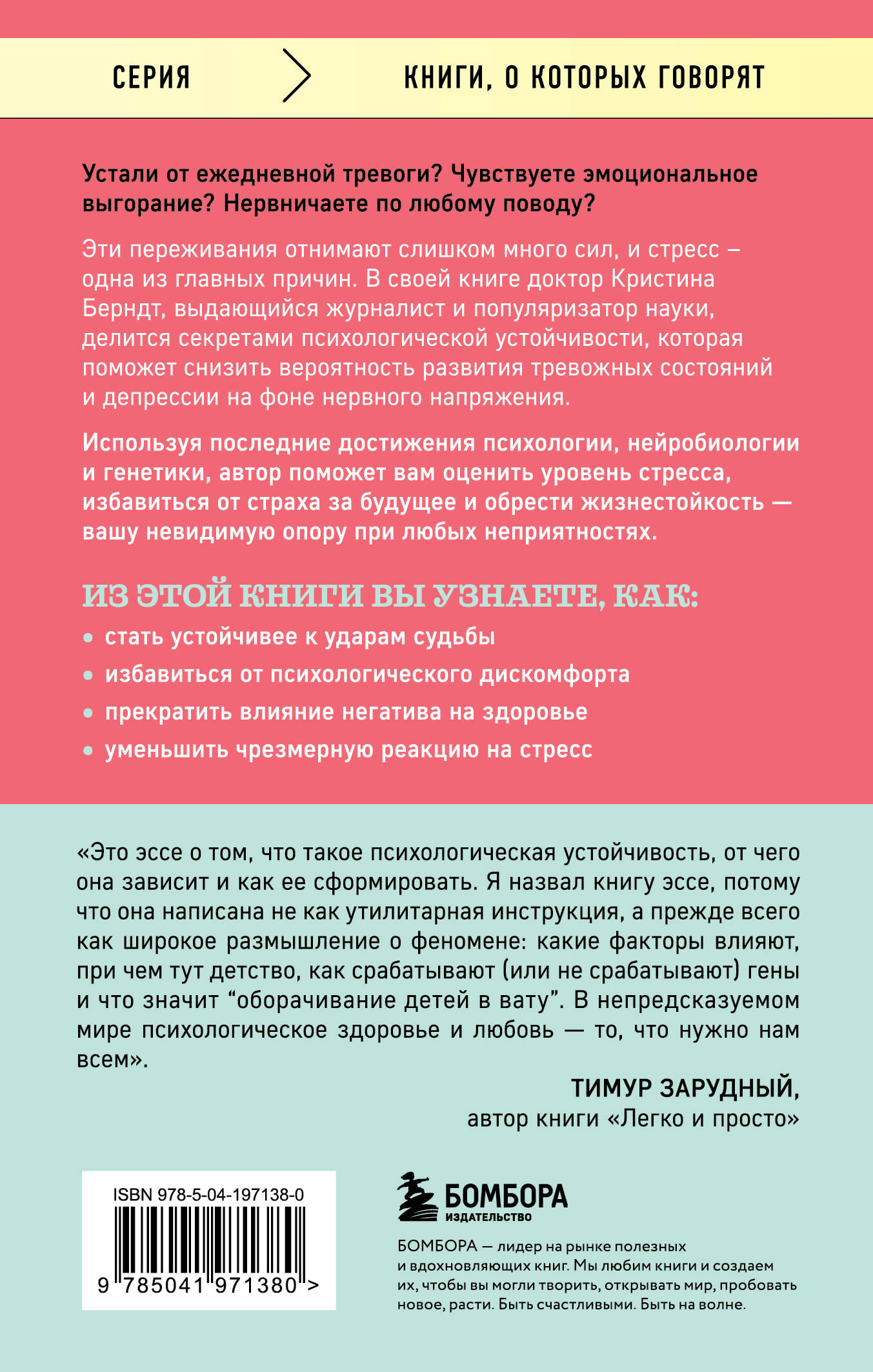 ВНУТРИ КНИГИ - ТЕСТ НА ПСИХОЛОГИЧЕСКУЮ УСТОЙЧИВОСТЬ И УРОВЕНЬ СТРЕССА. Устали от ежедневной тревоги? Чувствуете эмоциональное выгорание? Нервничаете по любому поводу? В своей книге доктор Кристина Берндт, выдающийся журналист и популяризатор науки, делится секретами психологической устойчивости, которая поможет снизить вероятность развития тревожных состояний и депрессии на фоне нервного напряжения. Используя последние достижения психологии, нейробиологии и генетики, автор поможет вам оценить уровень стресса, избавиться от страха за будущее и обрести жизнестойкость - вашу невидимую опору при любых неприятностях. Из этой книги вы узнаете, как: - стать устойчивее к ударам судьбы; - избавиться от психологического дискомфорта; - остановить влияние негатива на здоровье; - уменьшить чрезмерную реакцию на стресс.