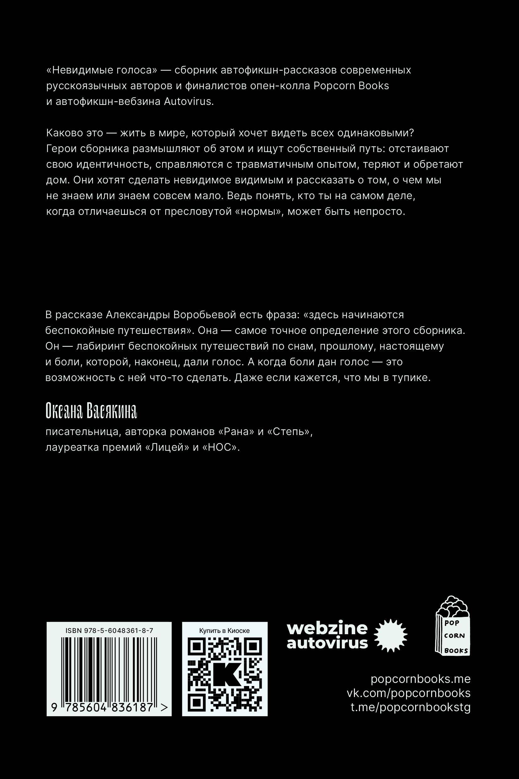 «Невидимые голоса» - сборник автофикшн-рассказов современных русскоязычных авторов и финалистов опен-колла Popcorn Books и автофикшн-вебзина Autovirus. Каково это - жить в мире, который хочет видеть всех одинаковыми? Герои сборника размышляют об этом и ищут собственный путь: отстаивают свою идентичность, справляются с травматичным опытом, теряют и обретают дом. Они хотят сделать невидимое видимым и рассказать о том, о чем мы не знаем или знаем совсем мало. Ведь понять, кто ты на самом деле, когда отличаешься от пресловутой «нормы», может быть непросто.| Издательство | ПОПКОРН БУКС ООО |