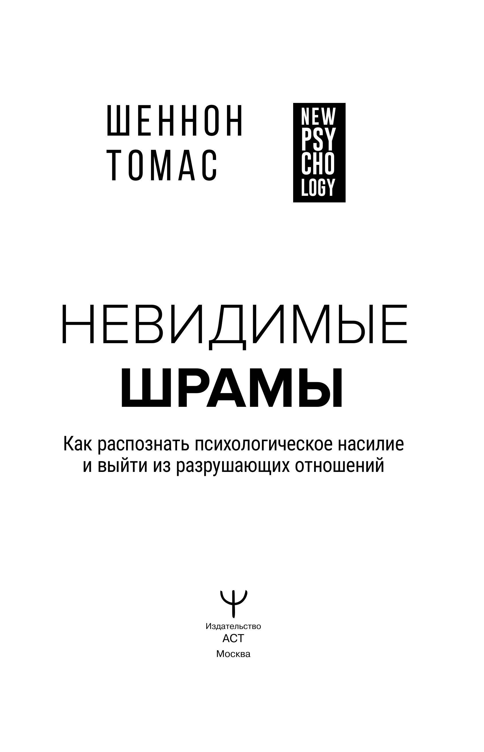 Книга Шеннон Томас «Невидимые шрамы», известная также под названием «Исцеление от невидимого насилия» - одна из лучших книг про психологический абьюз и абьюзивные отношения. СМИ часто цитируют книгу «Исцеление от невидимого насилия», потому что это одна из наиболее авторитетных и полных книг про абьюзеров и жертв абьюза. Книгу рекомендуют популярные блогеры и авторы книг про отношения: Таня Танк, Ника Набокова, Лиза Мока. Шеннон Томас - эксперт в помощи жертвам психологического абьюза - разработала программу исцеления от токсичных отношений, которая признана мировым сообществом и используется в 11 странах мира. Эта книга поможет распознать манипуляции, скрытое психологическое насилие, выстроить границы в отношениях с абьюзерами, преодолеть негативные последствия токсичных отношений и защитить себя.| Издательство | Издательство "АСТ" |