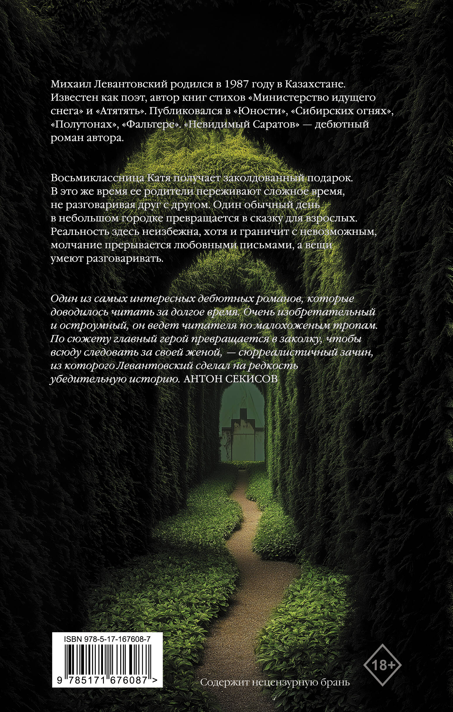 Михаил Левантовский родился в 1987 году в Казахстане. Известен как поэт, автор книг стихов "Министерство идущего снега" и "Атятять". Публиковался в "Юности", "Сибирских огнях", "Полутонах", "Фальтере". "Невидимый Саратов" - дебютный роман автора. Восьмиклассница Катя получает заколдованный подарок. В это же время ее родители переживают сложное время, не разговаривая друг с другом. Один обычный день в небольшом городке превращается в сказку для взрослых. Реальность здесь неизбежна, хотя и граничит с невозможным, молчание прерывается любовными письмами, а вещи умеют разговаривать. "Один из самых интересных дебютных романов, которые доводилось читать за долгое время. Очень изобретательный и остроумный, он ведет читателя по малохоженым тропам. По сюжету главный герой превращается в заколку, чтобы всюду следовать за своей женой, - сюрреалистичный зачин, из которого Левантовский сделал на редкость убедительную историю". Антон Секисов| Издательство | Издательство "АСТ" |
