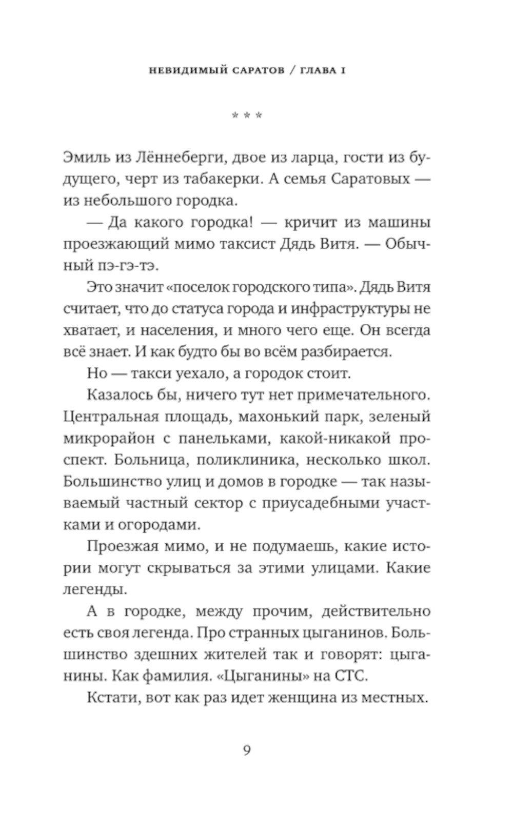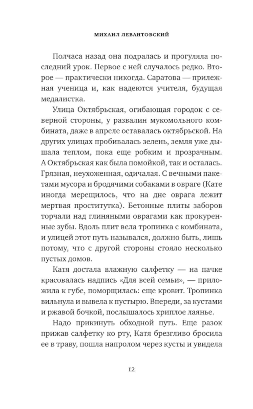 Михаил Левантовский родился в 1987 году в Казахстане. Известен как поэт, автор книг стихов «Министерство идущего снега» и «Атятять». Публиковался в «Юности», «Сибирских огнях», «Полутонах», «Фальтере». «Невидимый Саратов» - дебютный роман автора. Восьмиклассница Катя получает заколдованный подарок. В это же время ее родители переживают сложное время, не разговаривая друг с другом. Один обычный день в небольшом городке превращается в сказку для взрослых. Реальность здесь неизбежна, хотя и граничит с невозможным, молчание прерывается любовными письмами, а вещи умеют разговаривать.| Издательство | АСТ |