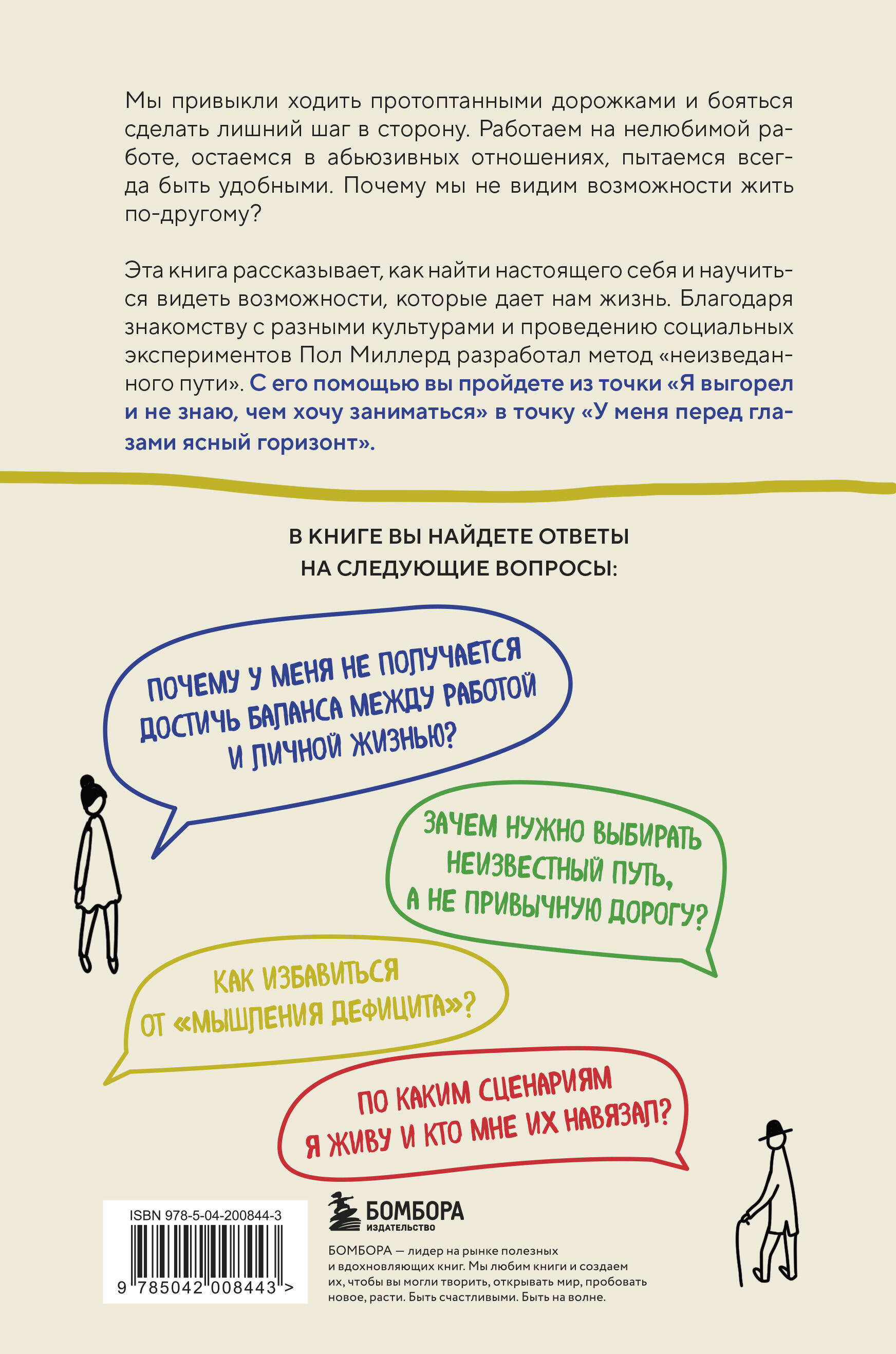 Мы привыкли ходить протоптанными дорожками и бояться сделать лишний шаг в сторону. Работаем на нелюбимой работе, остаемся в абьюзивных отношениях, пытаемся всегда быть удобными. Почему мы не видим возможности жить по-другому? Эта книга рассказывает, как найти настоящего себя и научиться видеть возможности, которые дает нам жизнь. Благодаря знакомству с разными культурами и проведению социальных экспериментов Пол Миллерд разработал метод «неизведанного пути». С его помощью вы пройдете из точки «Я выгорел и не знаю, чем хочу заниматься» в точку «У меня перед глазами ясный горизонт». В книге вы найдете ответы на следующие вопросы: - По каким сценариям я живу и кто мне их навязал? - Почему у меня не получается достичь баланса между работой и личной жизнью? - Как избавиться от «мышления дефицита»? - Зачем нужно выбирать неизвестный путь, а не привычную дорогу?| Издательство | ООО "Издательство "Эксмо" |
