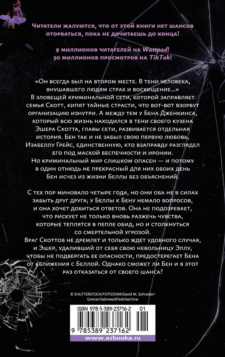 "Он всегда был на втором месте. В тени человека, внушавшего людям страх и восхищение…" В зловещей криминальной сети, которой заправляет семья Скотт, кипят тайные страсти, что вот-вот взорвут организацию изнутри, - предательства, хищения, заговоры, сепаратные союзы. А между тем у Бена Дженкинса, который всю жизнь находился в тени своего кузена Эшера Скотта, после смерти отца вынужденного возглавить сеть, развивается отдельная история. Бен так и не забыл свою первую любовь, Изабеллу Грейс, единственную, кто взаправду разглядел его под маской беспечности и иронии. Но криминальный мир слишком опасен - и потому в один отнюдь не прекрасный для них обоих день Бен исчез из жизни Беллы без объяснений. С тех пор миновало четыре года, но они оба не в силах забыть друг друга; у Беллы к Бену немало вопросов, и она хочет добиться ответов. Она не подозревает, что рискует не только вновь разжечь чувства, которые теплятся в пепле обид, но и столкнуться со смертельной угрозой. Враг семьи Скотт не дремлет и только ждет удобного случая, и Эшер, удаливший от себя свою невольницу Эллу, чтобы не подвергать ее опасности, предостерегает Бена от сближения с Беллой. Однако сможет ли Бен и в этот раз отказаться от своего шанса?| Издательство | Азбука-Аттикус Издат.группа ООО |