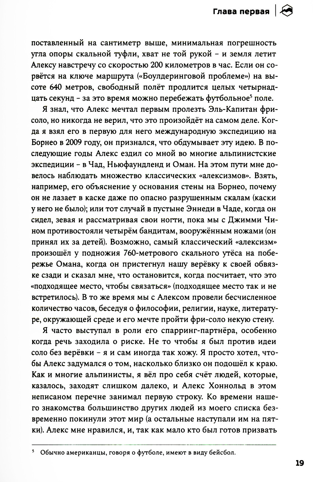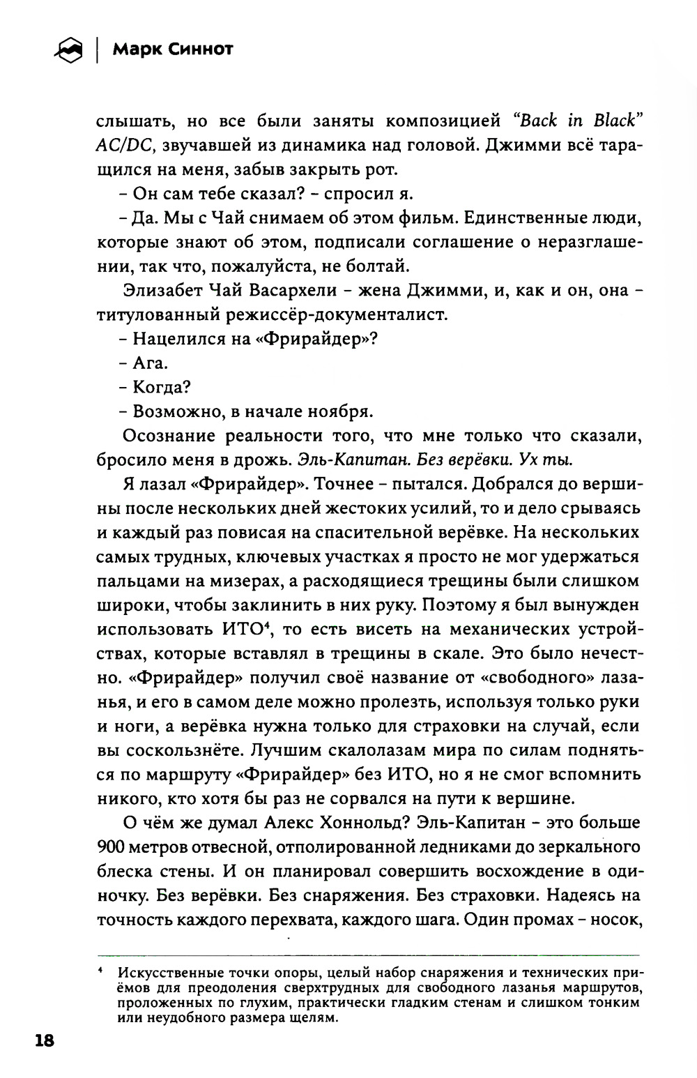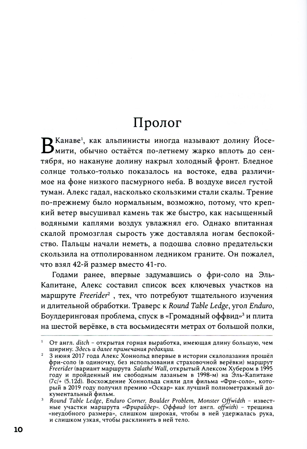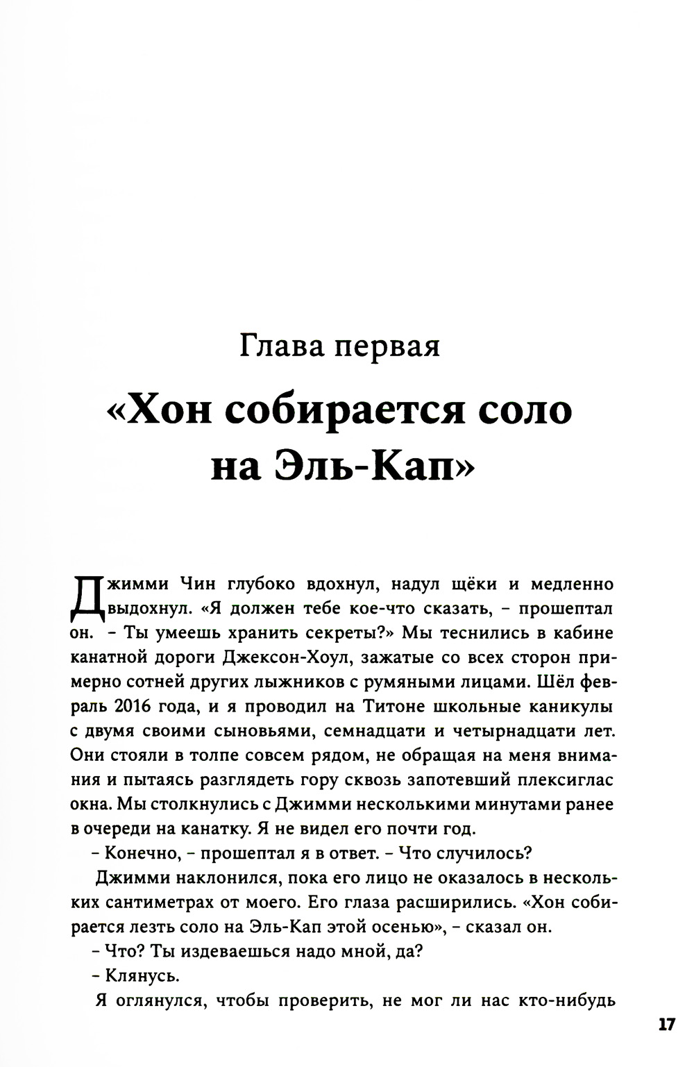 Алекс Хоннольд отправляется на восхождение всей своей жизни. Во что ему это обойдётся? Сколько времени и сил отнимет? Станет величайшим счастьем или источником боли и разочарования? Красная нить повествования - опасное увлечение завсегдатаев Йосемити фри-соло: с одной стороны - возможность поднять вопросы жизни и смерти, с другой - способ объяснить себе и окружающим природу этого безотчётного чувства, которое возникает у людей, сумевших удержаться на тонкой, как лезвие бритвы, грани невозможного.| Издательство | Библиотека Спорт-Марафон |