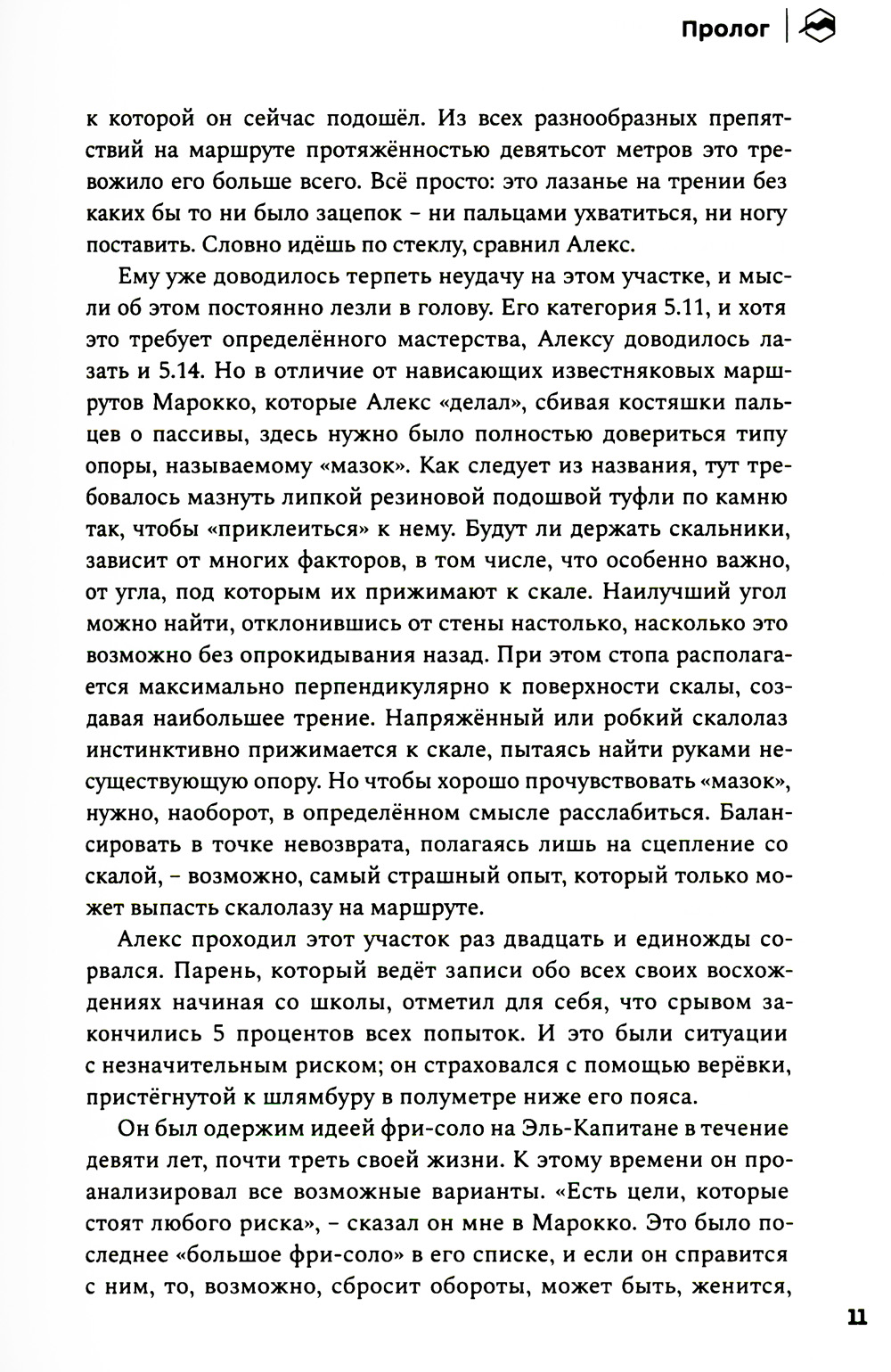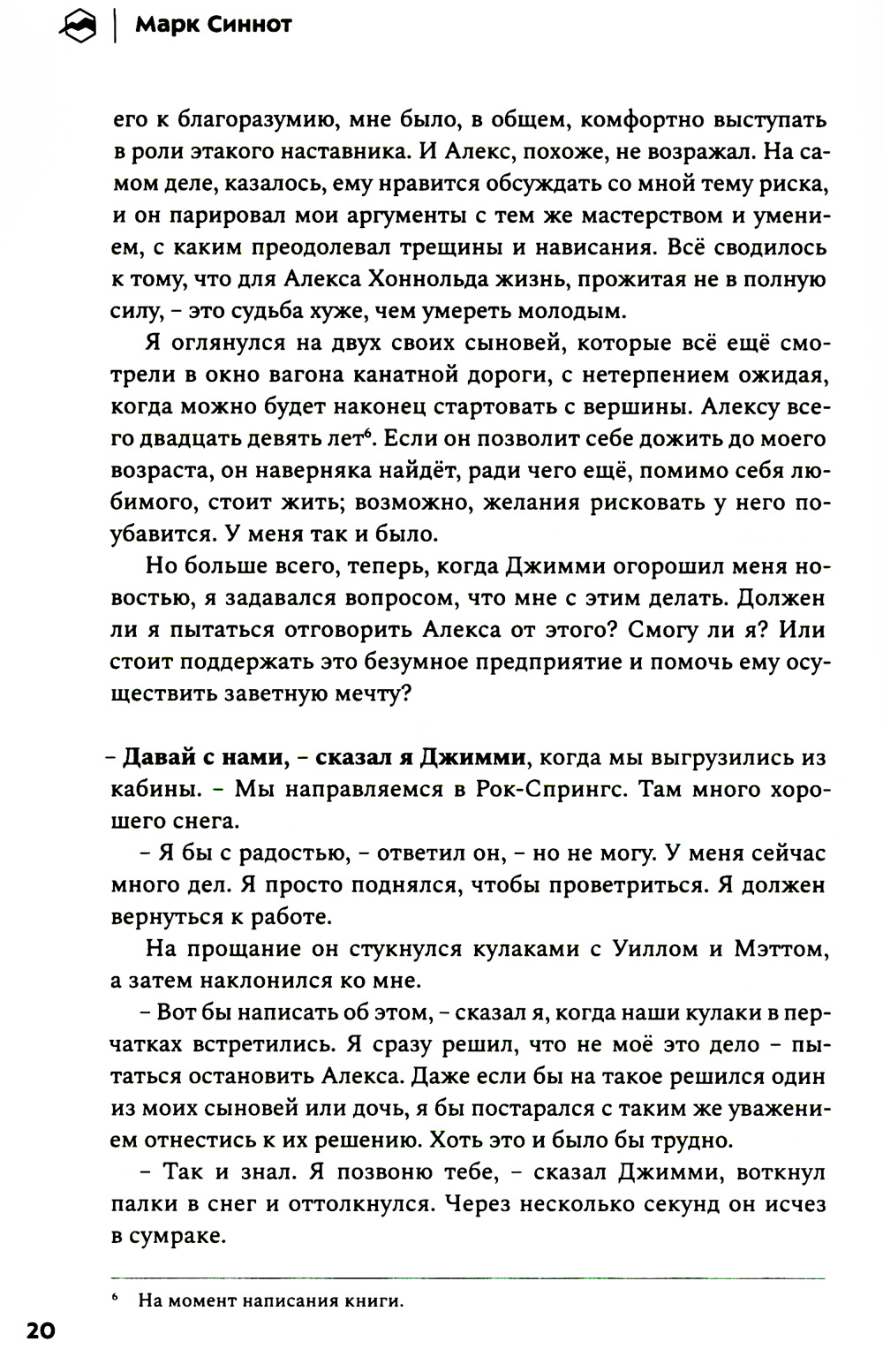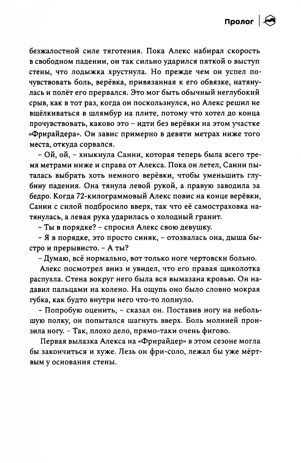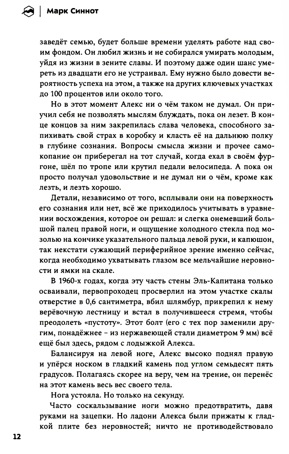 Алекс Хоннольд отправляется на восхождение всей своей жизни. Во что ему это обойдётся? Сколько времени и сил отнимет? Станет величайшим счастьем или источником боли и разочарования? Красная нить повествования - опасное увлечение завсегдатаев Йосемити фри-соло: с одной стороны - возможность поднять вопросы жизни и смерти, с другой - способ объяснить себе и окружающим природу этого безотчётного чувства, которое возникает у людей, сумевших удержаться на тонкой, как лезвие бритвы, грани невозможного.| Издательство | Библиотека Спорт-Марафон |