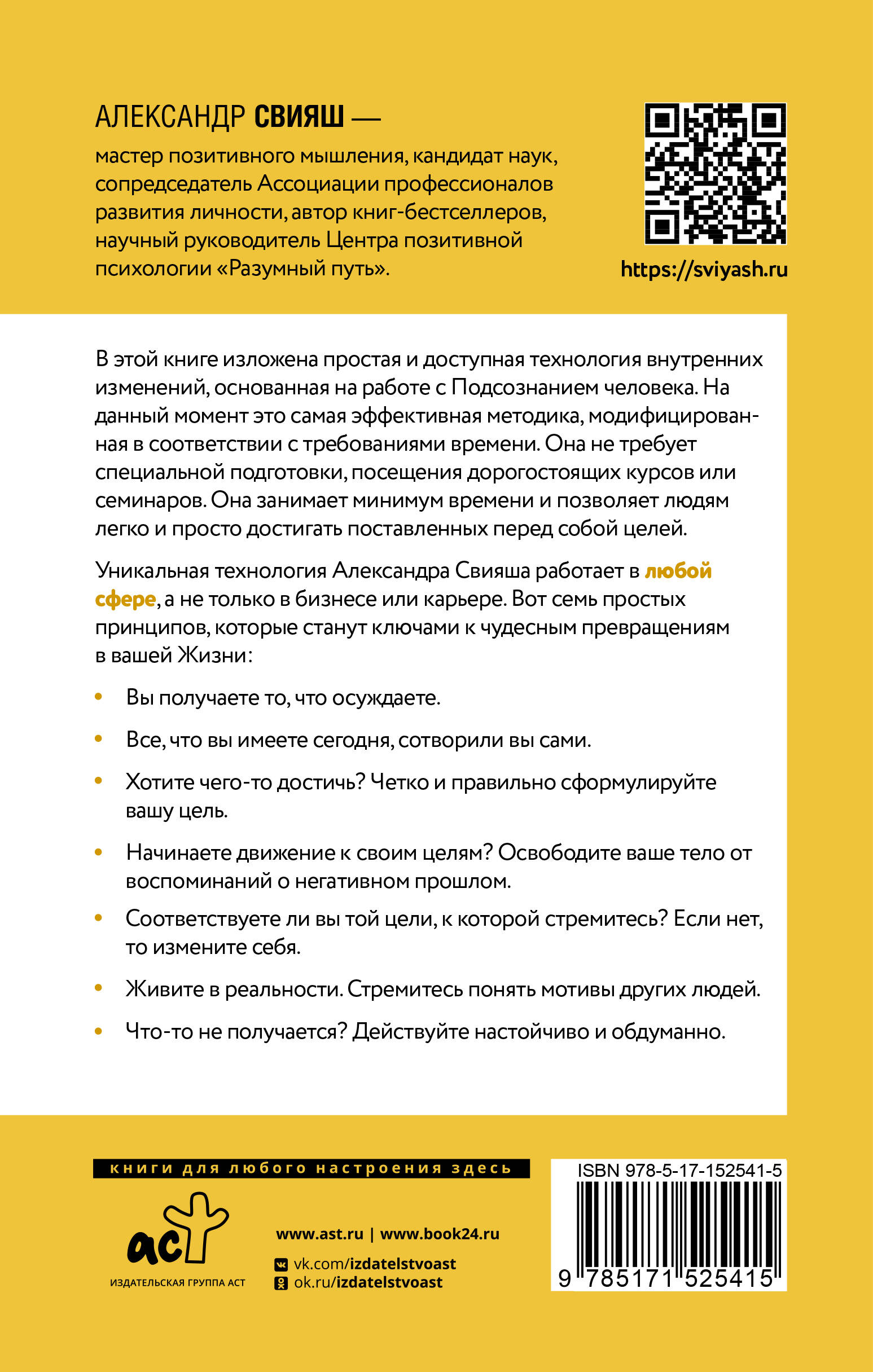 Александр Свияш - мастер позитивного мышления, кандидат наук, сопредседатель Ассоциации профессионалов развития личности, автор книг-бестселлеров, научный руководитель Центра позитивной психологии "Разумный путь". В книге "Невозможное возможно" изложена простая и доступная технология внутренних изменений, основанная на работе с Подсознанием человека. На данный момент это самая эффективная методика, модифицированная в соответствии с требованиями времени. Она не требует специальной подготовки, посещения дорогостоящих курсов или семинаров. Она занимает минимум времени и позволяет людям легко и просто достигать поставленных перед собой целей. Уникальная технология Александра Свияша работает в ЛЮБОЙ СФЕРЕ вашей жизни, а не только в бизнесе или карьере. Вот семь простых принципов, которые станут ключами к чудесным превращениям в вашей Жизни: • Вы получаете то, что осуждаете. • Все, что вы имеете сегодня, сотворили вы сами. • Хотите чего-то достичь? Четко и правильно сформулируйте вашу цель. • Начинаете движение к своим целям? Освободите ваше тело от воспоминаний о негативном прошлом. • Соответствуете ли вы той цели, к которой стремитесь? Если нет, то измените себя. • Живите в реальности. Стремитесь понять мотивы других людей. • Что-то не получается? Действуйте настойчиво и обдуманно.| Издательство | ИЗДАТЕЛЬСТВО "АСТ" |