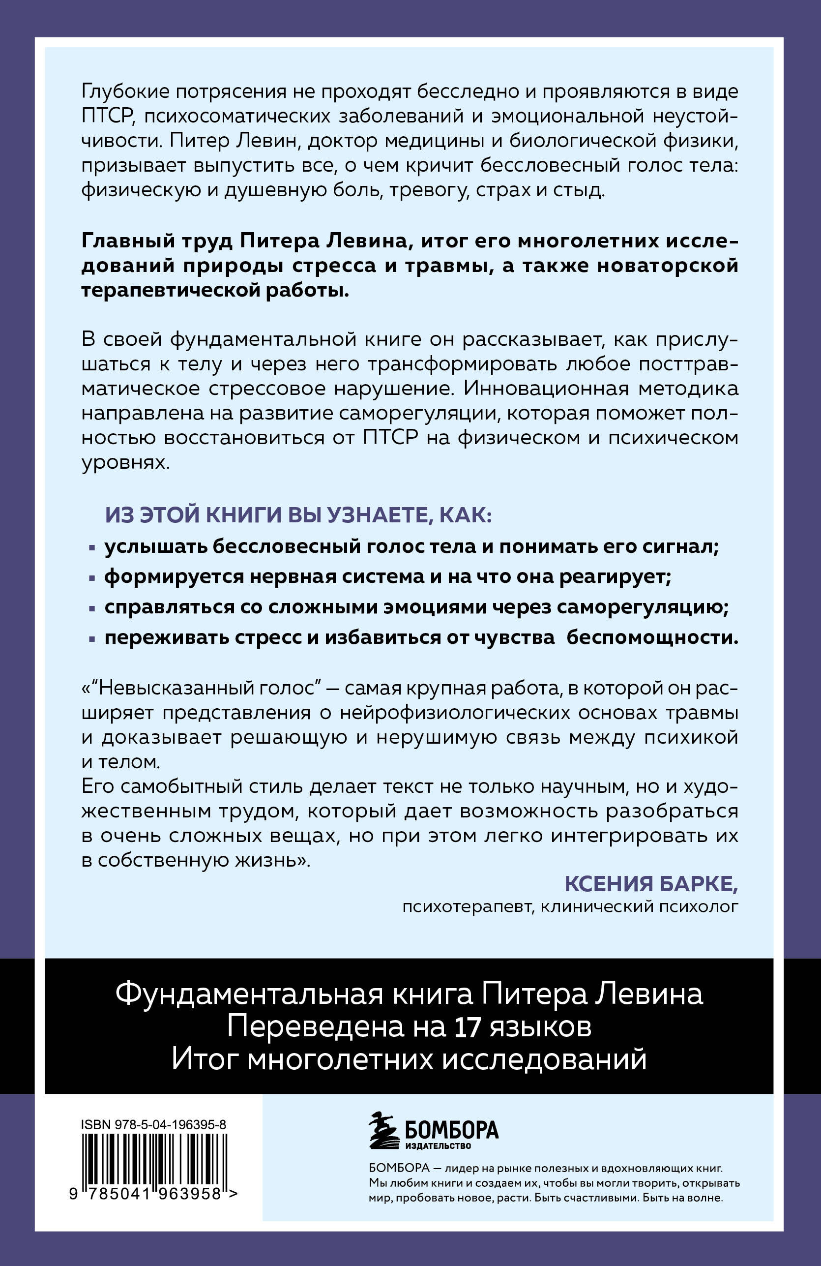 Главный труд Питера Левина, итог его многолетних исследований природы стресса и травмы, а также новаторской терапевтической работы. Глубокие потрясения не проходят бесследно и проявляются в виде ПТСР, психосоматических заболеваний и эмоциональной неустойчивости. В своей фундаментальной работе Питер Левин, доктор медицины и биологической физики, рассказывает, как прислушаться к телу и через него трансформировать любое посттравматическое стрессовое нарушение. Инновационная методика направлена на развитие саморегуляции, которая поможет полностью восстановиться от ПТСР на физическом и психическом уровнях.| Издательство | ООО "Издательство "Эксмо" |