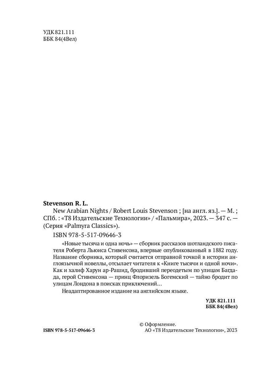 "Новые тысяча и одна ночь" - сборник рассказов шотландского писателя Роберта Льюиса Стивенсона, впервые опубликованный в 1882 году. Название сборника, который считается отправной точкой в истории англоязычной новеллы, отсылает читателя к "Книге тысячи и одной ночи". Как и халиф Харун ар-Рашид, бродивший переодетым по улицам Багдада, герой Стивенсона - принц Флоризель Богемский - тайно бродит по улицам Лондона в поисках приключений… Неадаптированное издание на английском языке.| Издательство | Т8 RUGRAM |