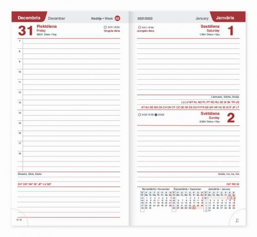 Apraksts: Plānotājos NEW LINE ir tabulas kalendārs, gada plāns, viena diena lappusē, nedēļu numerācija, valsts svētku un atzīmējamās dienas, karogu dienas, 38 citu valstu svētku dienas, norādīta pāreja uz vasaras un ziemas laiku, gadalaiku sākums, saullēkta un saulrieta laiki, mēness fāzes, zodiaka zīmju maiņas dienas, svarīgi telefona numuri, attāluu tabula, tālsarunu kodi, pasaules laiki, izmēru un mērvienību tabulas, kontaktu un piezīmju lapas.