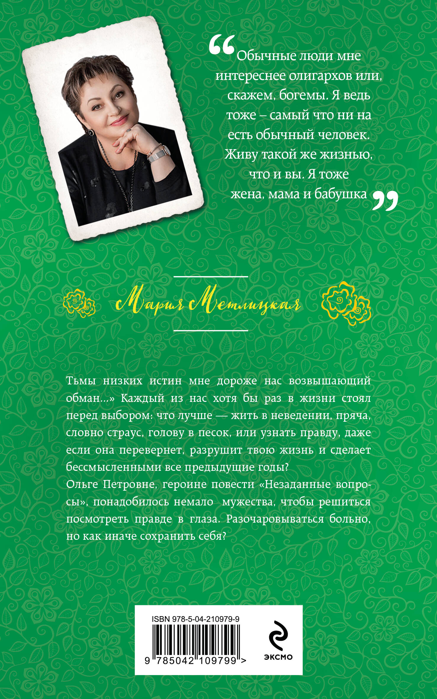 "Тьмы низких истин мне дороже нас возвышающий обман..." Каждый из нас хотя бы раз в жизни стоял перед выбором: что лучше - жить в неведении, пряча, словно страус, голову в песок, или узнать правду, даже если она перевернет, разрушит твою жизнь и сделает бессмысленными все предыдущие годы? Ольге Петровне, героине повести "Незаданные вопросы", понадобилось немало мужества, чтобы решиться посмотреть правде в глаза. Разочаровываться больно, но как иначе сохранить себя?| Издательство | ООО "Издательство "Эксмо" |