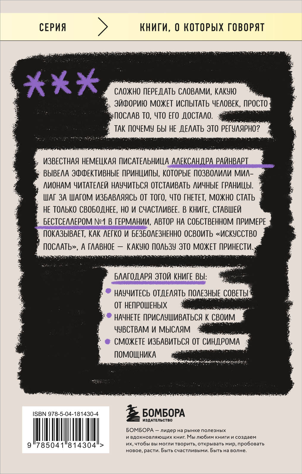 Сложно передать словами, какую эйфорию может испытать человек, просто послав то, что его достало. Так почему бы не делать это регулярно? Известная немецкая писательница Александра Райнварт вывела эффективные принципы, которые позволили миллионам читателей научиться отстаивать личные границы. Шаг за шагом избавляясь от того, что гнетет, можно стать не только свободнее, но и счастливее. В книге, ставшей бестселлером № 1 в Германии, автор на собственном примере показывает, как легко и безболезненно освоить «искусство послать», а главное - какую пользу это может принести. Благодаря этой книге вы: • научитесь отделять полезные советы от непрошеных; • начнете прислушиваться к своим чувствам и мыслям; • сможете избавиться от синдрома помощника.| Издательство | ООО "Издательство "Эксмо" |