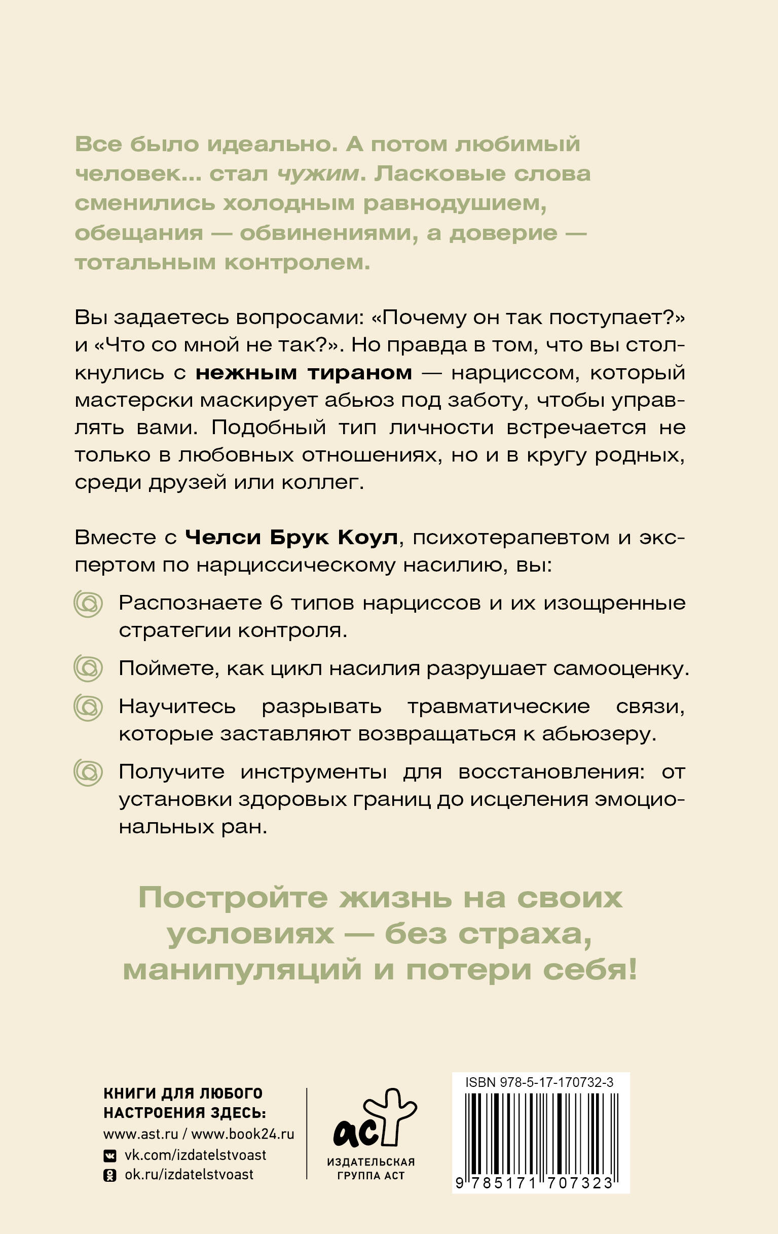 Все было идеально. А потом любимый человек… стал чужим. Ласковые слова сменились холодным равнодушием, обещания - обвинениями, а доверие - тотальным контролем. Вы задаетесь вопросами: "Почему он так поступает?" и "Что со мной не так?". Но правда в том, что вы столкнулись с нежным тираном - нарциссом, который мастерски маскирует абьюз под заботу, чтобы управлять вами. Подобный тип личности встречается не только в любовных отношениях, но и в кругу родных, среди друзей или коллег. Вместе с Челси Брук Коул, психотерапевтом и экспертом по нарциссическому насилию, вы: • Распознаете 6 типов нарциссов и их изощренные стратегии контроля. • Поймете, как цикл насилия разрушает самооценку. • Научитесь разрывать травматические связи, которые заставляют возвращаться к абьюзеру. • Получите инструменты для восстановления: от установки здоровых границ до исцеления эмоциональных ран. Постройте жизнь на своих условиях - без страха, манипуляций и потери себя!| Издательство | Издательство "АСТ" |
