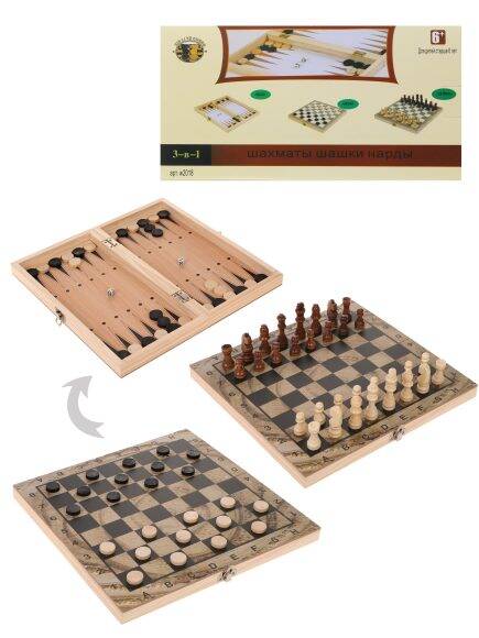 Привычные настольные игры не уходят в небытие! Шахматы, шашки и нарды не менее увлекательны, чем любые электронные игры, ведь у этих традиционных игр есть важная составляющая, которой не имеет ни один электронный гаджет, - живое общение! За игровым полем могут встретиться не только ровесники, но и люди разного поколения - родители и дети, дети и внуки. Ну а польза подобных игр для развития умственных способностей и мышления очевидна каждому! В наборе: ящичек-поле, а также фигуры для игры в шахматы, шашки и нарды. Размер игрового поля: 24х24 см. Изготовлено из дерева с элементами металла. Рекомендованный возраст: 3 года +
