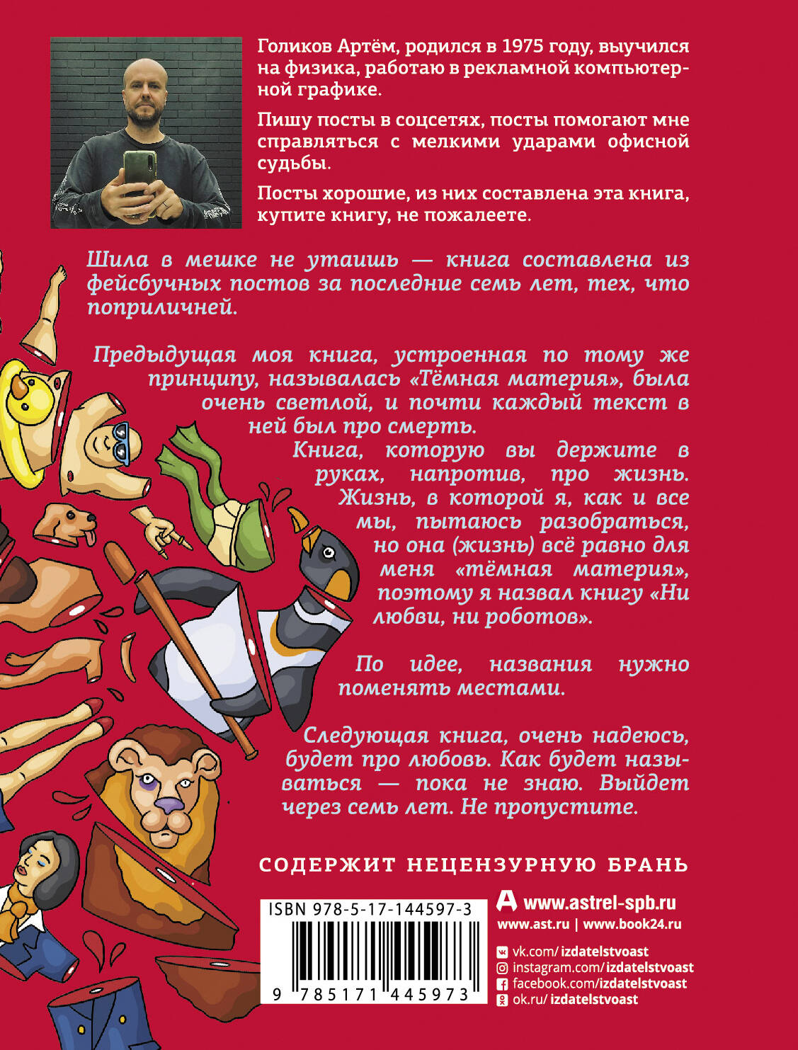 Шила в мешке не утаишь - книга составлена из фейсбучных постов за последние семь лет, тех, что поприличней. Предыдущая моя книга, устроенная по тому же принципу, называлась "Тёмная материя", была очень светлой, и почти каждый текст в ней был про смерть. Книга, которую вы держите в руках, напротив, про жизнь. Жизнь, в которой я, как и все мы, пытаюсь разобраться, но она (жизнь) всё равно для меня "тёмная материя", поэтому я назвал книгу "Ни любви, ни роботов". По идее, названия нужно поменять местами. Следующая книга, очень надеюсь, будет про любовь. Как будет называться - пока не знаю. Выйдет через семь лет. Не пропустите.| Издательство | АСТ |