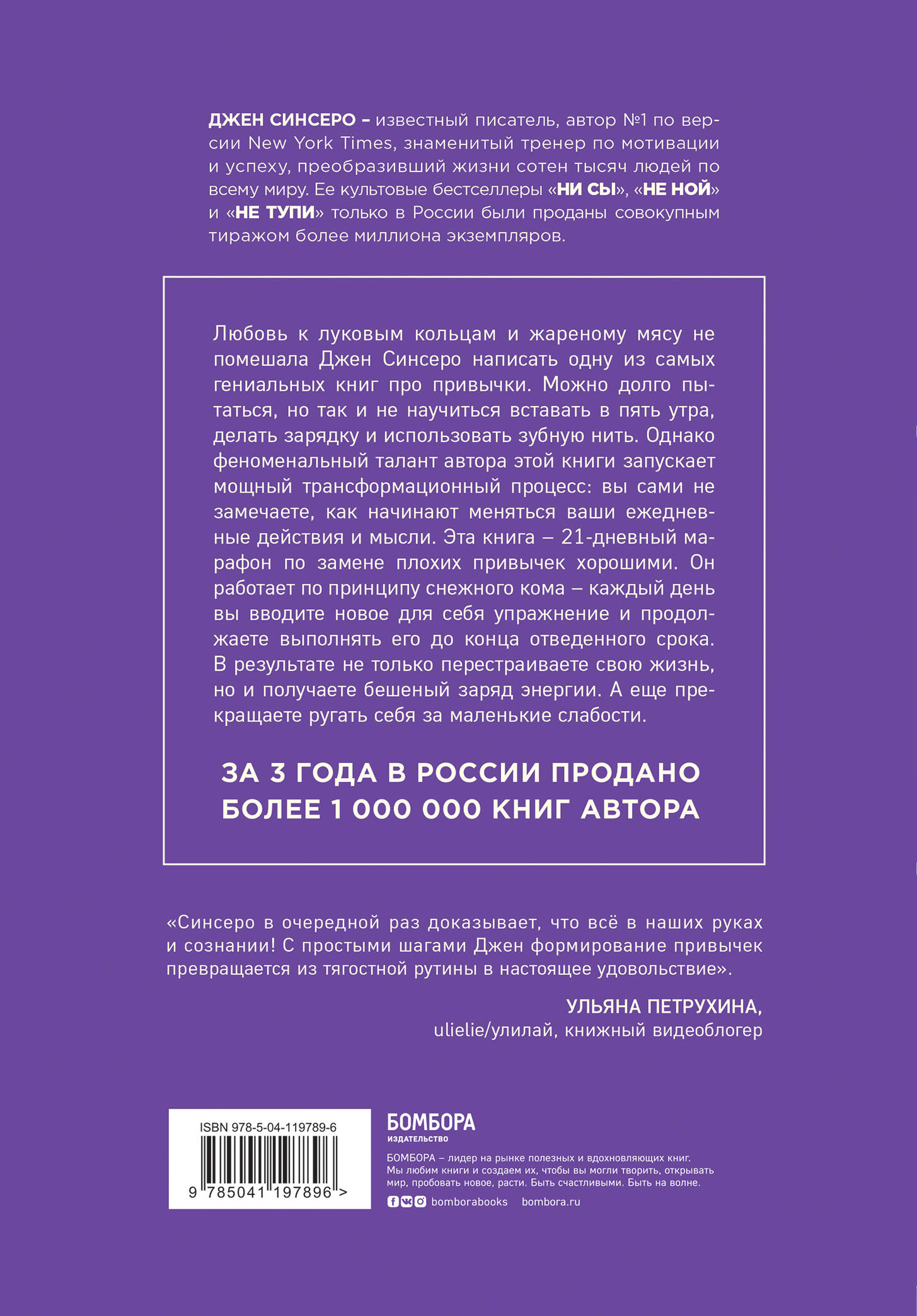 ОТ АВТОРА САМЫХ ПРОДАЮЩИХСЯ КНИГ В РОССИИ! Книги Джен Синсеро стали мировым феноменом. «НИ СЫ» вот уже более трех лет находится в ТОП-20 AMAZON. Тексты этого автора заряжены на трансформацию жизни: невозможно «просто прочитать» их, хочется сразу начать меняться. «НИ ЗЯ. Откажись от пагубных слабостей, обрети силу духа и стань хозяином своей судьбы» - это не просто очередная книга по саморазвитию. Она выделяется из общей массы своей самобытностью, подачей и неожиданными инсайтами. Книга рассказывает о том, как у нас формируются привычки, зачем они нужны и что вообще можно считать «привычкой». Благодаря этой книге вы: • Получите безудержную мотивацию для достижения целей. • Сможете избавиться от негативных установок и всего, что тянет вас на дно. • Наконец-то оторвете пятую точку от дивана и начнете действовать. • Настроите свое подсознание на поиск возможностей. Мало кто знает, но наша жизнь на 70% состоит из привычек. И они могут быть не только физическими, но и ментальными. Научиться пить воду по утрам и класть ключи от машины на место можно и самостоятельно. А вот перестать ругать себя за промахи и начать видеть собственные достижения сможет не каждый. А ведь жить в негативе - это тоже привычка. Об авторе Джен Синсеро - автор № 1 по версии New York Times, знаменитый мотивационный тренер, путешествующий по всему свету со своими выступлениями. «Синсеро в очередной раз доказывает, что все в наших руках и сознании! С простыми шагами Джен формирование привычек превращается из тягостной рутины в настоящее удовольствие». - УЛЬЯНА ПЕТРУХИНА, Ulielie, книжный видеоблогер| Издательство | Форс Украина ООО |
