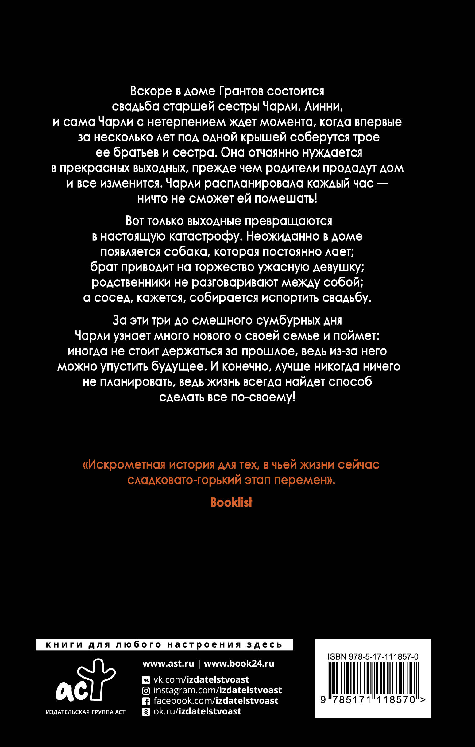 Вскоре в доме Грантов состоится свадьба старшей сестры Чарли, Линни, и сама Чарли с нетерпением ждет момента, когда впервые за несколько лет под одной крышей соберутся трое ее братьев и сестра. Она отчаянно нуждается в прекрасных выходных, прежде чем родители продадут дом и все изменится. Чарли распланировала каждый час - ничто не сможет ей помешать! Вот только выходные превращаются в настоящую катастрофу. Неожиданно в доме появляется собака, которая постоянно лает; брат приводит на торжество ужасную девушку; родственники не разговаривают между собой; а сосед, кажется, собирается испортить свадьбу. За эти три до смешного сумбурных дня Чарли узнает много нового о своей семье и поймет: иногда не стоит держаться за прошлое, ведь из-за него можно упустить будущее. И конечно, лучше никогда ничего не планировать, ведь жизнь найдет способ сделать все по-своему!| Издательство | ИЗДАТЕЛЬСТВО "АСТ" |