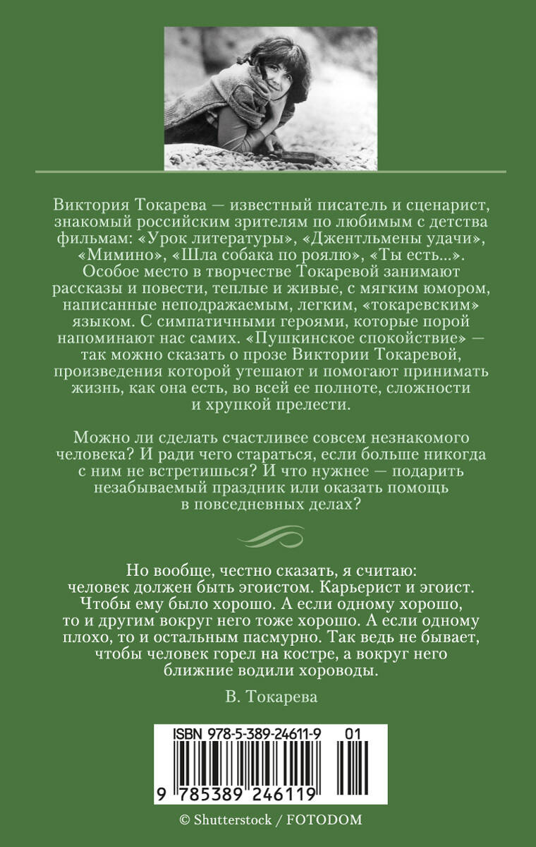 Виктория Токарева - известный писатель и сценарист, знакомый российским зрителям по любимым с детства фильмам: "Урок литературы", "Джентльмены удачи", "Мимино", "Шла собака по роялю", "Ты есть...". Особое место в творчестве Токаревой занимают рассказы и повести, теплые и живые, с мягким юмором, написанные неподражаемым, легким, "токаревским" языком. С симпатичными героями, которые порой напоминают нас самих. "Пушкинское спокойствие" - так можно сказать о прозе Виктории Токаревой, произведения которой утешают и помогают принимать жизнь, как она есть, во всей ее полноте, сложности и хрупкой прелести. В настоящее издание вошли рассказы и повести из одноименного сборника 1983 года.| Издательство | Азбука-Аттикус Издат.группа ООО |