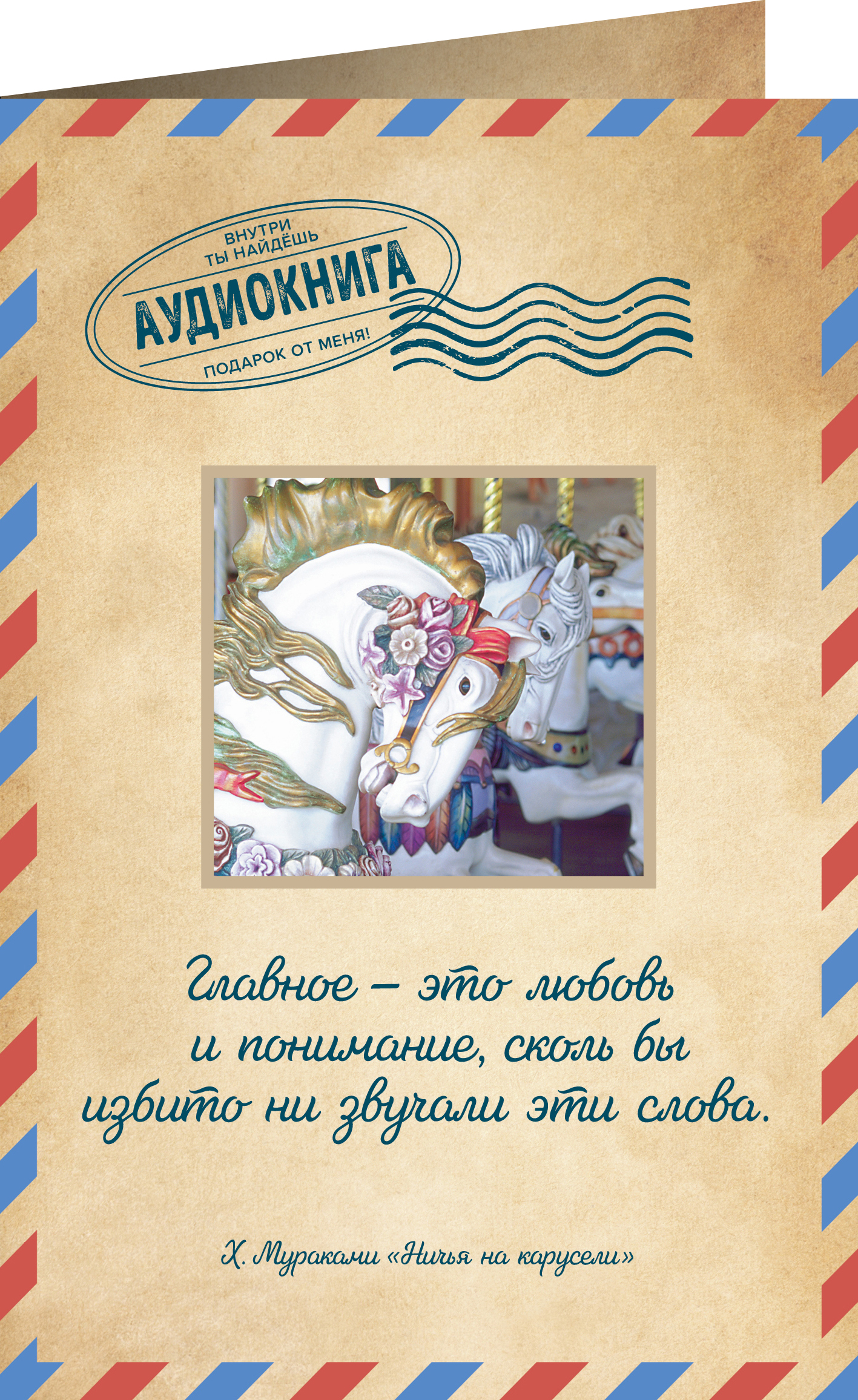 Книга по-прежнему остается лучшим подарком, аудиокнига - еще и полезным, потому что снижает нагрузку на зрение, уменьшает общий уровень стресса, освобождает время для других дел. Выбери открытку - подари аудиокнигу. В сборнике рассказов Мураками сравнивает жизнь с каруселью, с которой невозможно сойти: мы никого не обгоняем и никто не обгоняет нас, однако нам это вращение кажется яростной ничьей с воображаемыми врагами.