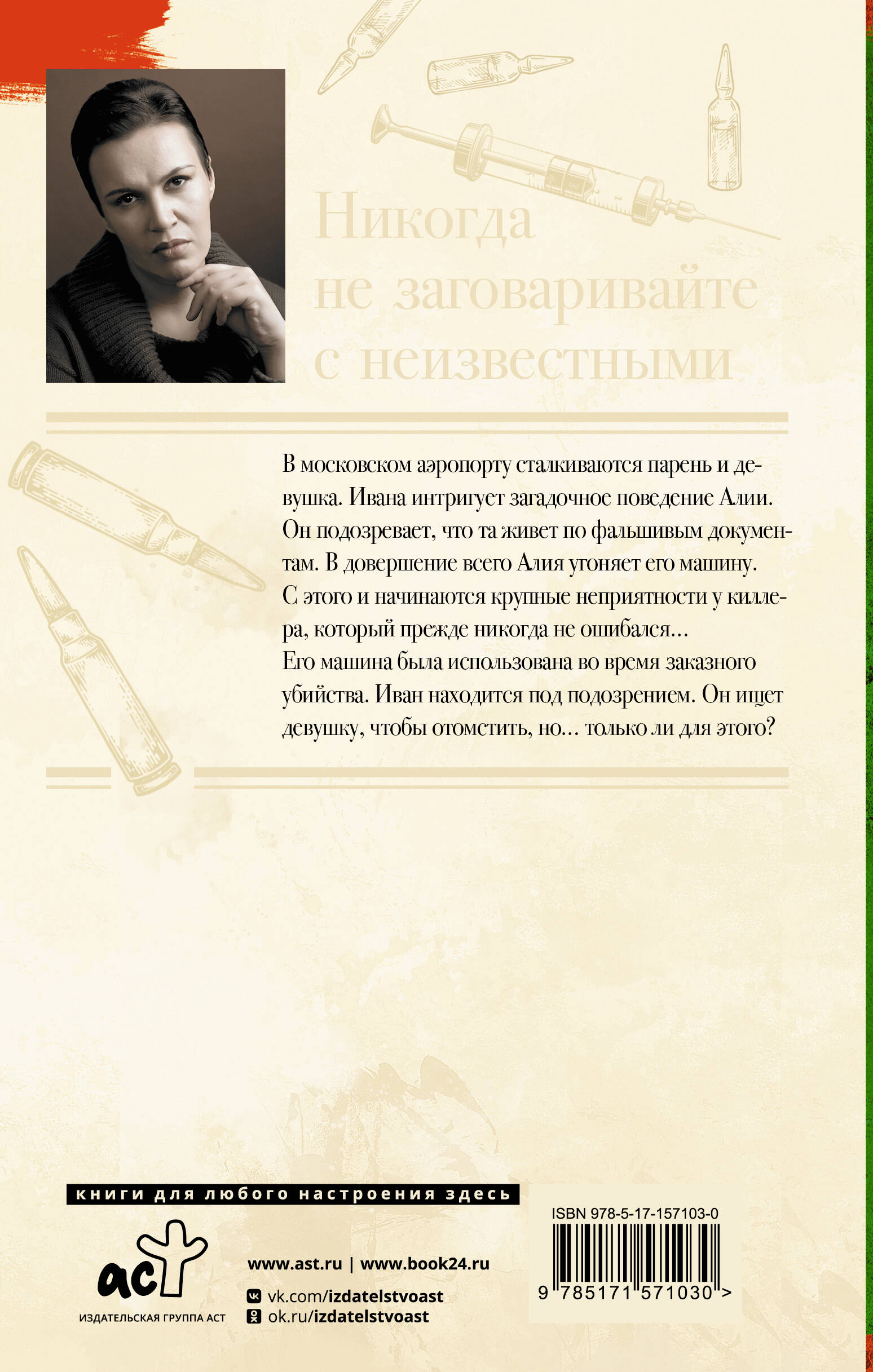 В московском аэропорту сталкиваются парень и девушка. Ивана интригует загадочное поведение Алии. Он подозревает, что та живет по фальшивым документам. В довершение всего Алия угоняет его машину. С этого и начинаются крупные неприятности у киллера, который прежде никогда не ошибался… Его машина была использована во время заказного убийства. Иван находится под подозрением. Он ищет девушку, чтобы отомстить, но… только ли для этого?| Издательство | ИЗДАТЕЛЬСТВО "АСТ" |