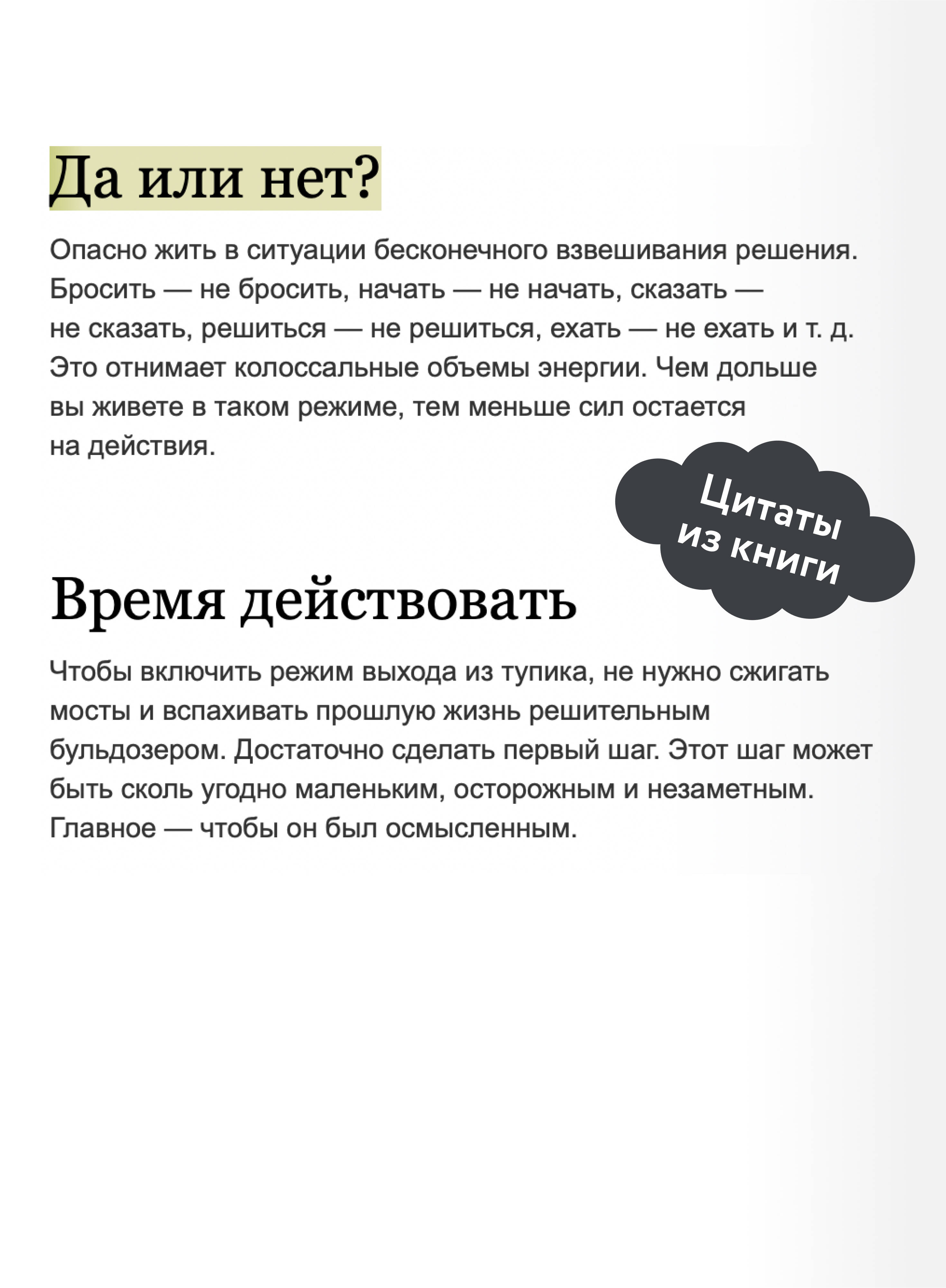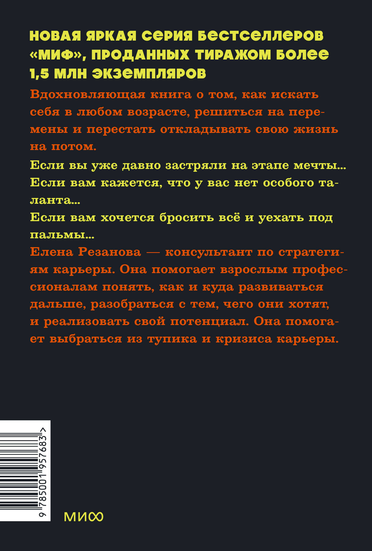 Вдохновляющая книга в о том, как решиться на перемены, набраться смелости, сменить нелюбимую работу, перестать откладывать жизнь на потом. Мотивирует и дает план, помогает решить проблему "хочу, но не знаю, с чего начать". Теперь в формате покетбука. Новый формат - для самых важных и любимых книг. Мы сохранили качество: под мягкой обложкой - белая бумага, ляссе и уникальный дизайн. Ничто не помешает наслаждаться чтением без компромиссов. От автора: Когда всё окончательно достает, самые смелые из нас начинают что-то делать - как правило, то, что первым приходит в голову, кажется логичным и правильным. Чаще всего действуют шаблонными путями, ведущими в тупик. И проигрывают, не понимая почему. И больше не пытаются. Моя задача - помочь вам не только начать путь, но и не заблудиться по дороге. Потому что тропинки, ведущие в тупик или к обрыву, выглядят вполне протоптанными - и их очень легко спутать с правильными. В первой части книги я расскажу вам, "как не надо": почему мы годами застреваем в режиме "отложенная жизнь" и как самые ответственные и "правильные" из нас загоняют себя в ловушку, из которой рискуют не выбраться никогда. Во второй части вы узнаете, как отключается автопилот и мы берем управление на себя. Я избавлю вас от мифа о корпоративном рабстве, а также от иллюзии того, что если ничего не делать, стабильность вам обеспечена. В третьей части вы поймете, что же такое ваши амбиции и какой мощной силой вы обладаете, а еще узнаете, что выдающийся талант и высокий интеллект не так много значат для успеха, как вы думали. В четвертой части мы поговорим о неверных поворотах и шаблонных подходах, которые могут обойтись вам дорого. Я расскажу о ловушке настоящего призвания, о вирусных мечтах, о том, откуда берется всеобщее желание идти в благотворительность, и о том, почему люди могут быть несчастны в своем собственном бизнесе. В пятой части мы перейдем непосредственно к плану действий. Если у вас есть большая мечта, вы поймете, как к ней наконец подступиться. Если мечты и интересов нет, вы начнете действовать так, чтобы они у вас появились. В заключительной, шестой части мы разберемся с любимыми отговорками и блоками, которые мы все мастера городить на своем пути. Речь пойдет про денежные страхи, про боязнь что-то менять в кризис, про другие опасения и о том, как не дать им остановить вас. В книге есть практические блоки - это техники, которые здорово работают и не раз проверены. Также в конце каждой главы вас ждет выжимка из главных мыслей и как минимум один стереотип, который мы перезагрузили. Моя задача - показать вам, как на самом деле происходит переход от состояния "я не на своем месте" в состояние счастливого профессионала. Вы поймете, что на практике всё проще и интереснее, чем вы думали. Фишки книги: - Удобный и качественный формат - книгу можно брать с собой куда угодно. - Покетбуки занимают мало места, но приносят много пользы. - В серии покетбуков выходят самые важные книги МИФа. - Есть закладка-ляссе, а значит, вы всегда сможете продолжить читать книгу с того места, где остановились. Для кого эта книга: Эта книга написана для вас, если вы годами живете в режиме "я не на своем месте, но не знаю, что с этим делать". Это значит, что вы пропускаете свою жизнь. Вы не реализуете свой потенциал и не привносите в мир то, что могли бы привнести.| Издательство | МАНН, 
