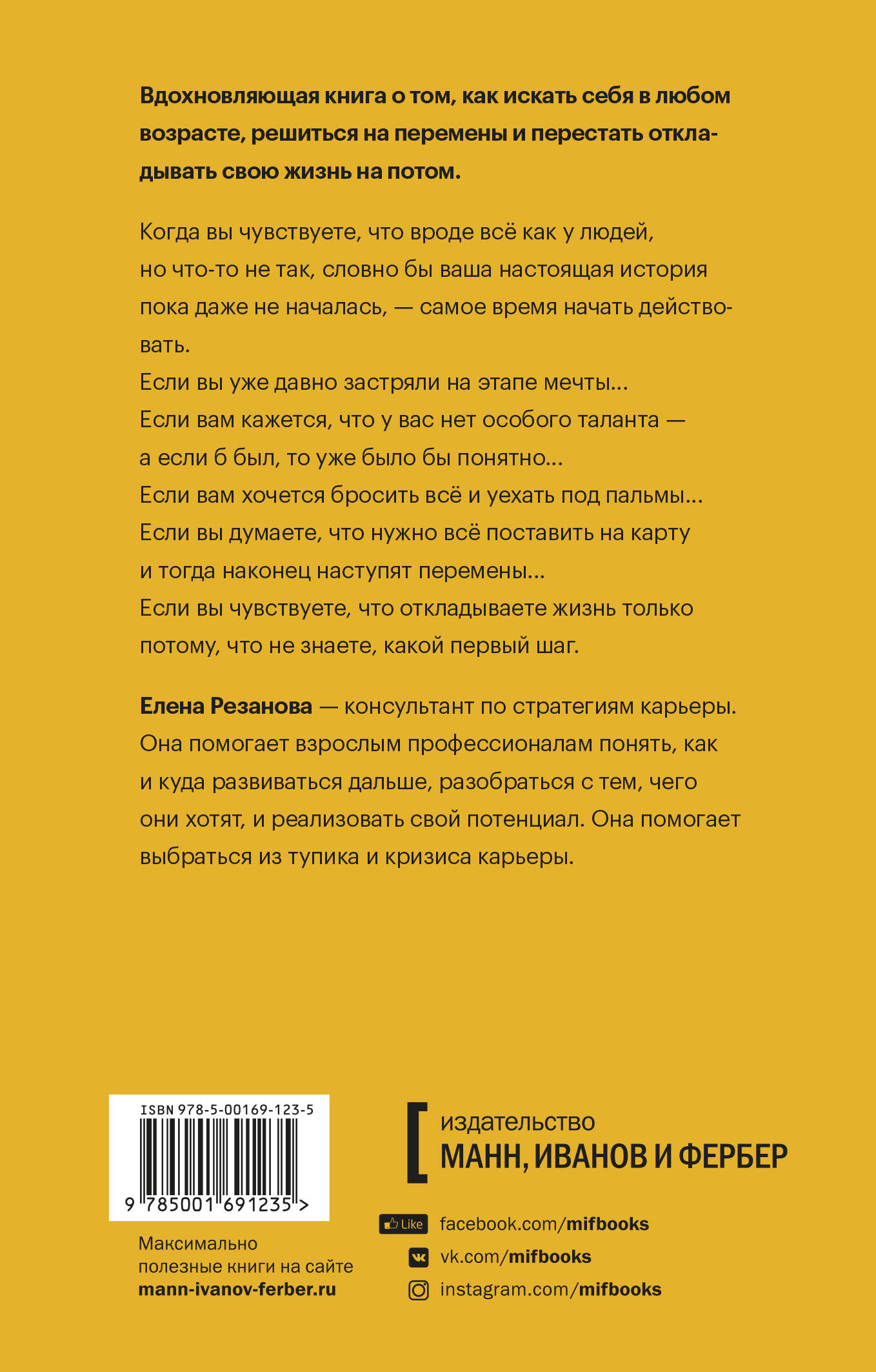 Вдохновляющая книга о том, как решиться на перемены, как набраться смелости сменить нелюбимую работу, перестать откладывать свою жизнь на потом. Мотивирует и дает план, помогающий решить проблему "хочу, но не знаю, с чего начать".| Издательство | МАНН, ИВАНОВ И ФЕРБЕР ООО |