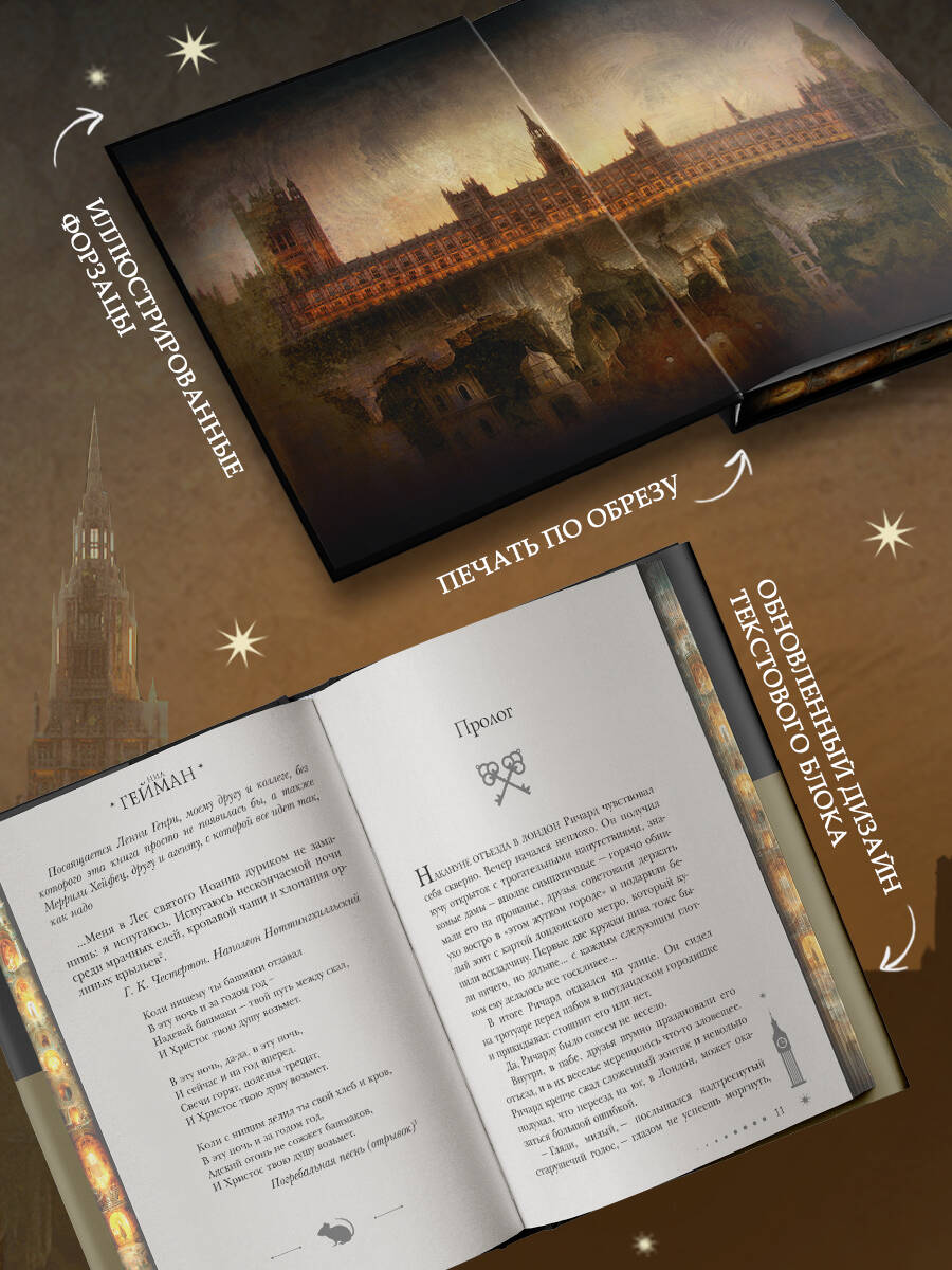 - Культовый роман в подарочном издании. Обложка с тиснением фольгой, цветные иллюстрации на форзацах, печать по срезу, новое оформление текстового блока. - Городское фэнтези от популярного автора романов, рассказов, графических романов и киносценариев. Ричард ведет размеренную, почти образцовую жизнь в Лондоне и даже не подозревает о существовании другой стороны этого города. Но однажды он встречает израненную девушку, молящую о помощи. Он не смог пройти мимо, и благородство очень дорого ему стоило. Теперь в его квартире живут другие люди, знакомые и друзья не узнают мужчину, а по документам такого человека и вовсе не существует. Ричард попал в мистический Нижний Лондон, и единственный способ вернуться назад - найти ту самую девушку. Но не ему одному она нужна…| Издательство | Издательство "АСТ" |