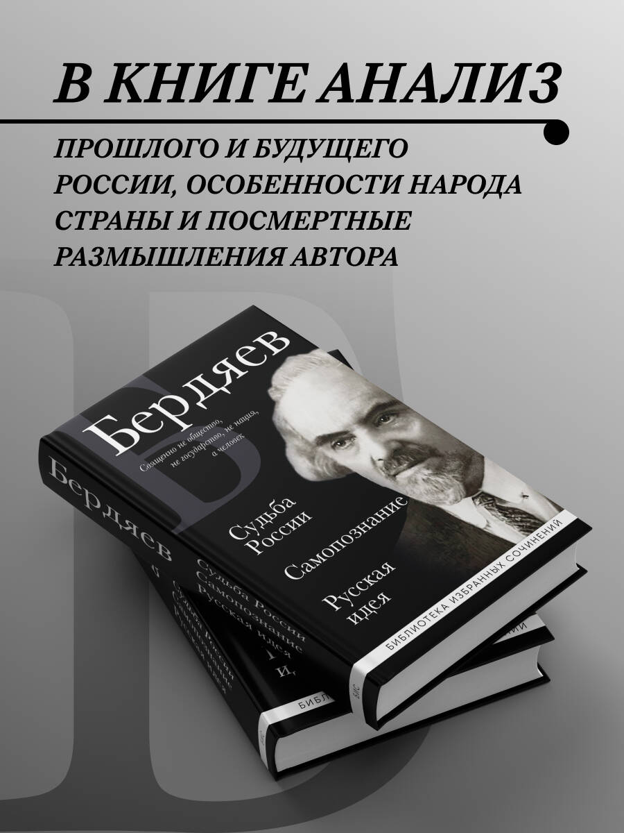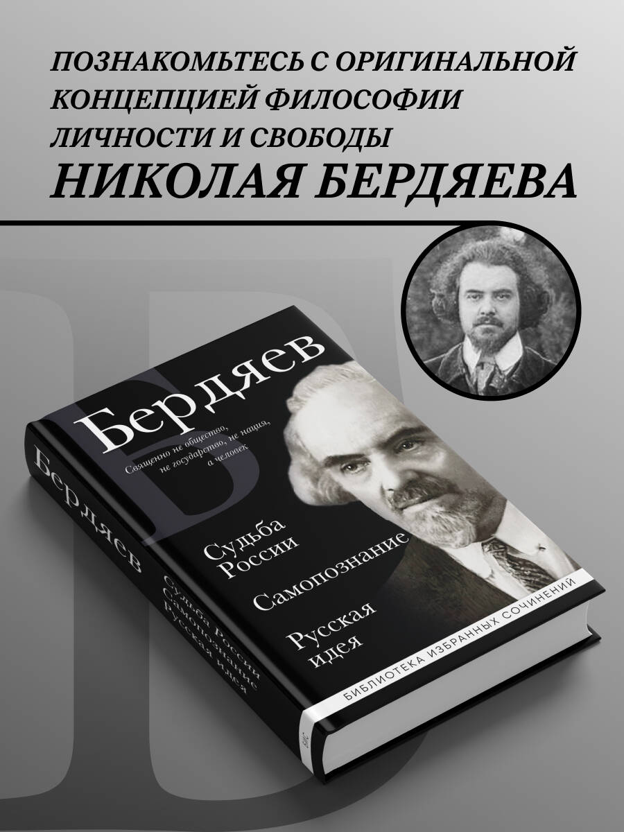 Крупнейший русский философ первой половины XX века, автор оригинальной концепции философии личности и свободы - Николай Бердяев в своем творчестве сумел синтезировать и переосмыслить выводы целого ряда современных ему направлений отечественной и зарубежной философско-исторической мысли. Его «Русская идея» на долгие годы останется одним из замечательных произведений отечественного самосознания. В ней анализируется история России в контексте русской идеи, православной веры, духовности и свободы. «Судьба России» рассматривает особенности характера и душевного типа русского народа, его влияние на судьбу страны и духовное переосмысление истории государства для построения лучшего будущего. Книга «Самопознание», опубликованная посмертно, стала одним из последних произведений Бердяева, своеобразным итогом его размышлений. Материал этой книги настолько глубок и оригинален, что многие ее положения и выводы сохраняют актуальность и в наши дни.
