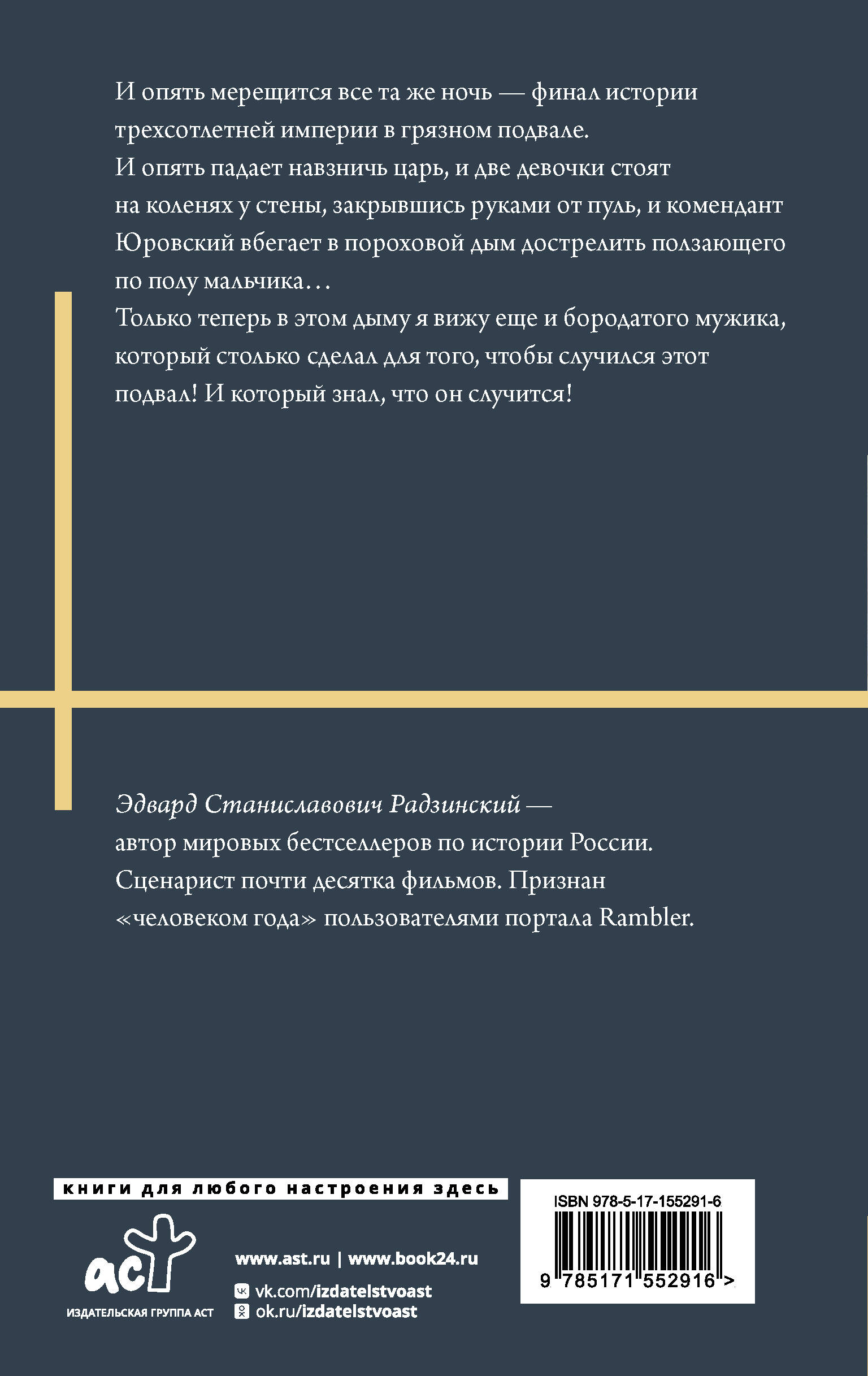 И опять мерещится все та же ночь - финал истории трехсотлетней империи в грязном подвале. И опять падает навзничь царь, и две девочки стоят на коленях у стены, закрывшись руками от пуль, и комендант Юровский вбегает в пороховой дым дострелить ползающего по полу мальчика… Только теперь в этом дыму я вижу еще и бородатого мужика, который столько сделал для того, чтобы случился этот подвал! И который знал, что он случится!| Издательство | ИЗДАТЕЛЬСТВО "АСТ" |