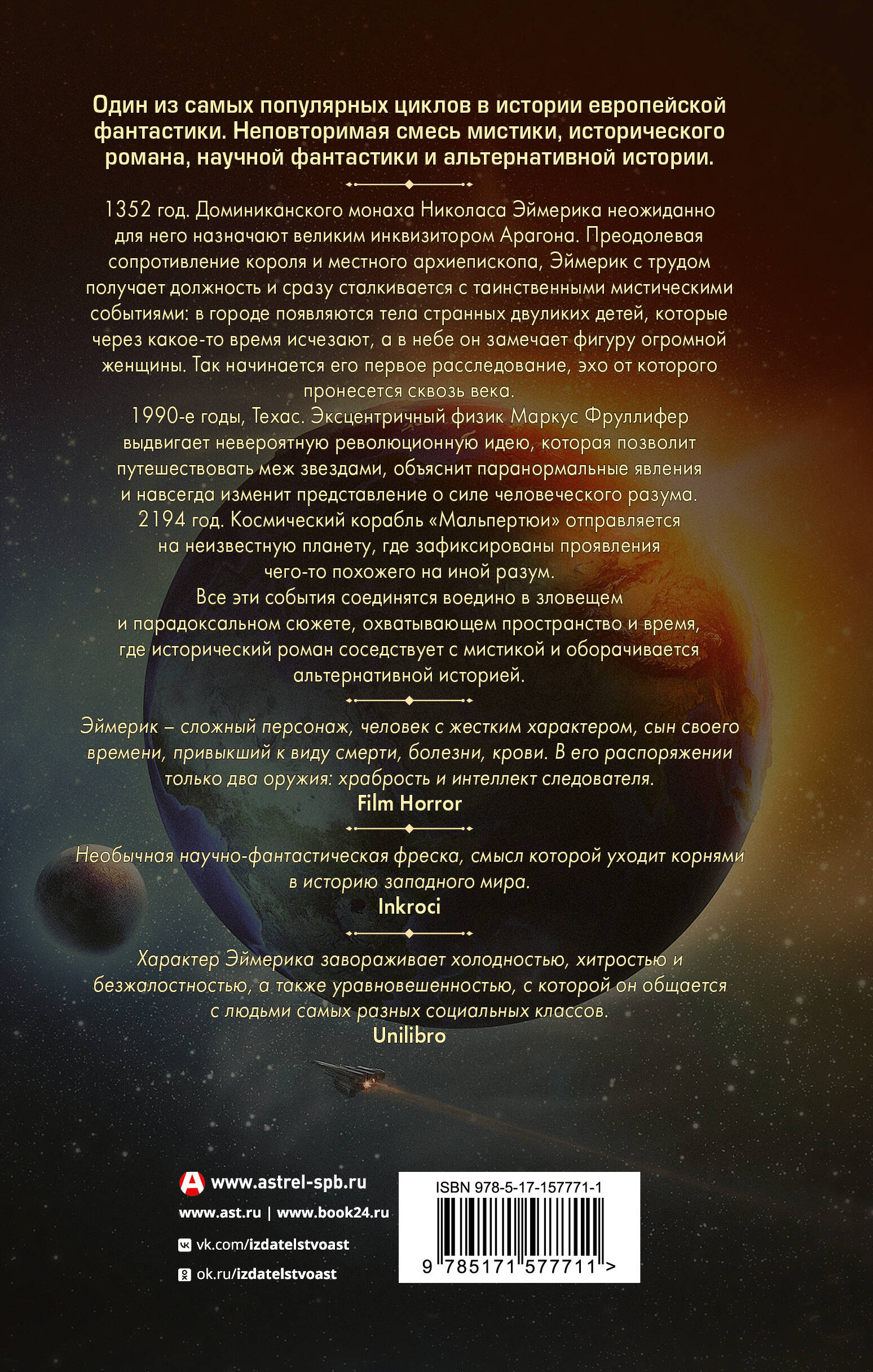 - «Николас Эймерик, инквизитор» - первая книга одноименного цикла итальянского писателя Валерио Эванджелисти. На русском языке издается впервые. - Цикл о Николасе Эймерике - один из самых успешных в истории европейского фэнтези. Он состоит из десяти романов, по мотивам которых вышло несколько серий комиксов и даже видеоигра. - Цикл о Николасе Эймерике - лауреат Большой премии воображения, премий «Италия» и «Урания» и премии Эйфелевой башни. - Цикл о Николасе Эймерике - взрывная смесь фэнтези, исторического детектива и научной фантастики. Идеально подходит для всех поклонников книг Яцека Пекары и Анджея Сапковского.