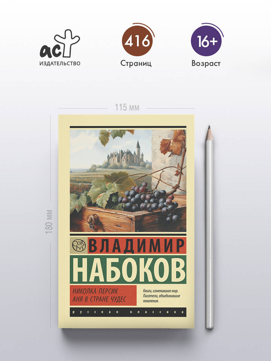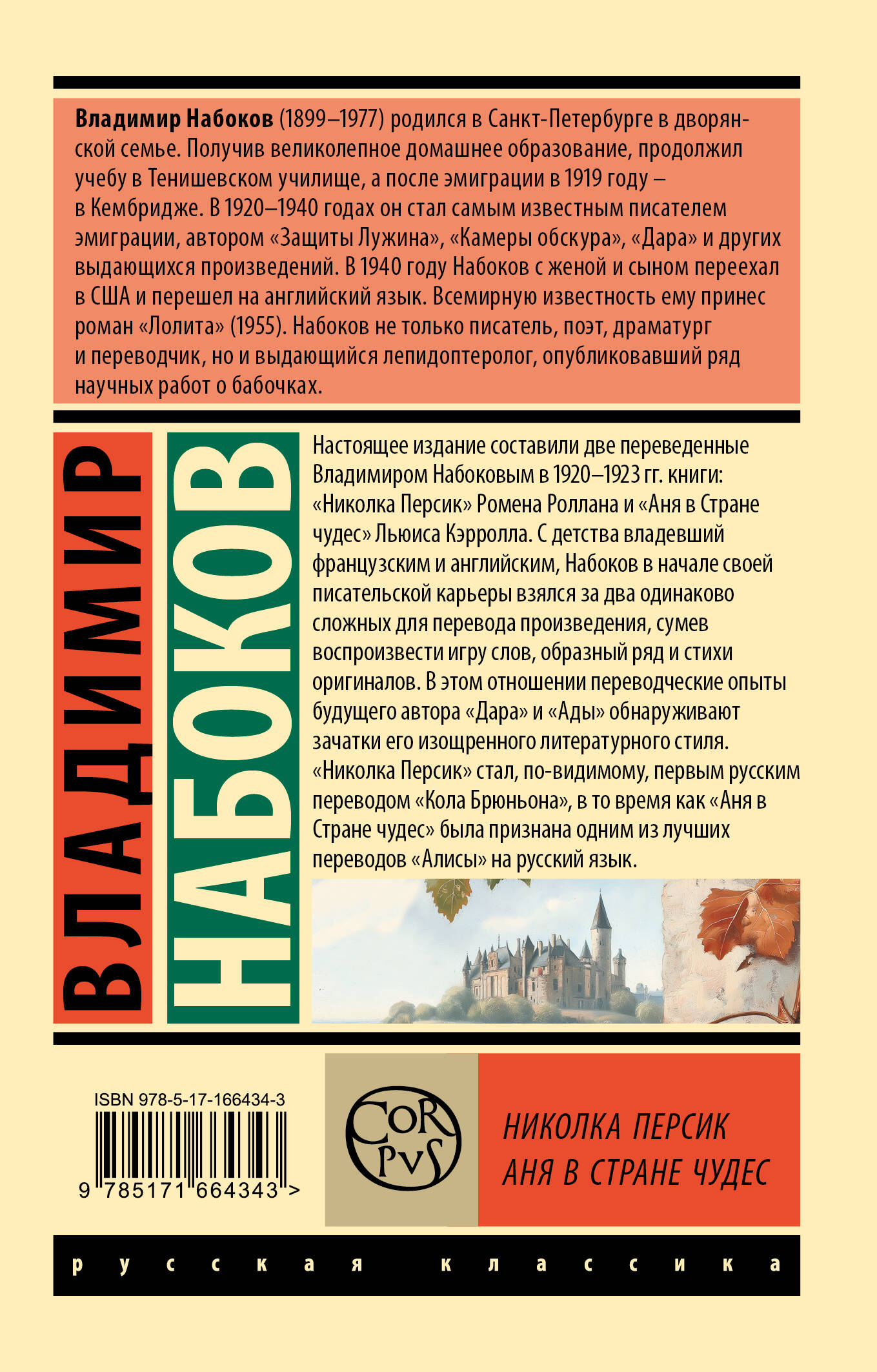 Настоящее издание составили две переведенные Владимиром Набоковым в 1920-1923 гг. книги: "Николка Персик" ("Кола Брюньон") Ромена Роллана и "Аня в Стране чудес" Льюиса Кэрролла. С детства владевший французским и английским, Набоков в начале своей писательской карьеры взялся за два одинаково сложных для перевода произведения и показал виртуозное владение русским языком, сумев воспроизвести игру слов, образный ряд и стихи оригиналов. В этом отношении переводческие опыты будущего автора "Дара" и "Ады" обнаруживают зачатки его изощренного литературного стиля. "Николка Персик" стал, по‑видимому, первым русским переводом "Кола Брюньона", в то время как "Аня в Стране чудес" была признана одним из лучших переводов "Алисы" на русский язык.| Издательство | Издательство "АСТ" |