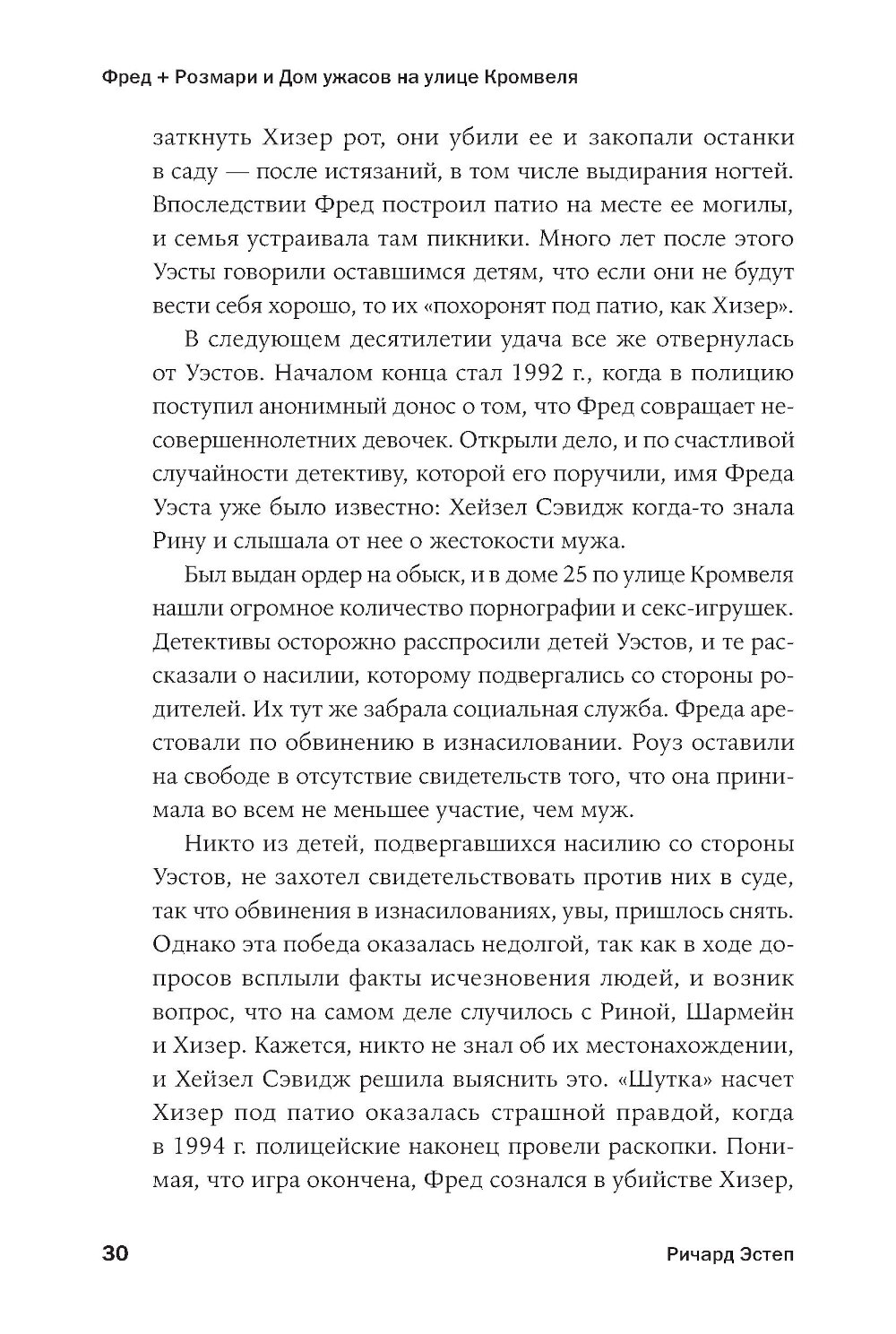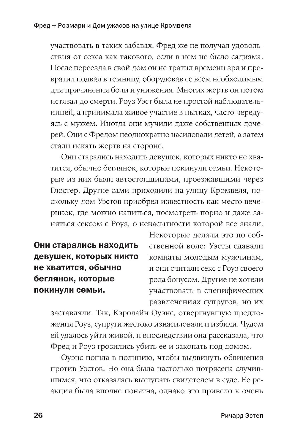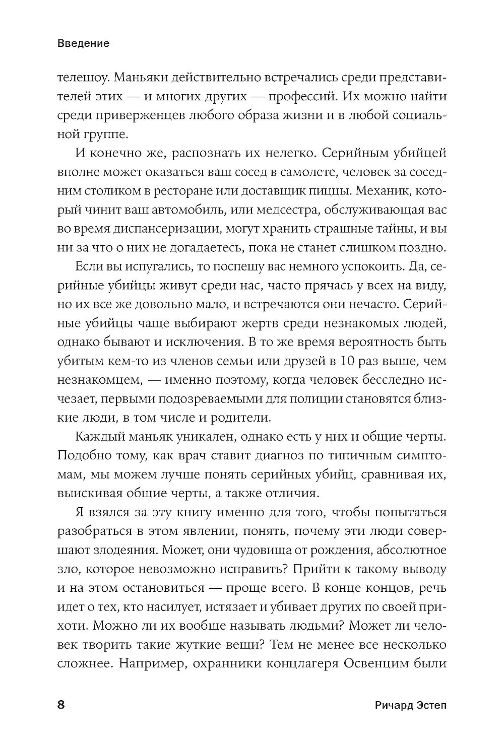 Извращенная психика и респектабельный образ жизни, хладнокровная жестокость и неприметная внешность, крайняя степень садизма и способность очаровывать людей. Каждый серийный убийца уникален, но у них есть и общие черты, вызывающие у нас ужас и любопытство. Ричард Эстеп исследует профили известных маньяков, чтобы изучить сходства и различия их мотивов, поведения и методов совершения преступлений. Его цель - понять глубинные механизмы человеческой психики и обстоятельства, которые формируют будущего серийного убийцу. Истории Джека-потрошителя, Джеффри Дамера, Клоуна-убийцы Джона Уэйна Гейси, Андрея Чикатило и других печально известных личностей подчеркивают универсальность факторов, способствующих формированию убийцы: врожденная склонность к жестокости, пережитые травмы, социальная изоляция и ненависть к себе и окружающим. Это одновременно пугающее и завораживающее чтение, основанное на детальных исследованиях и архивных материалах, предназначено для тех, кто интересуется криминалистикой, психологией и мотивацией серийных убийц.| Издательство | Альпина Паблишер |