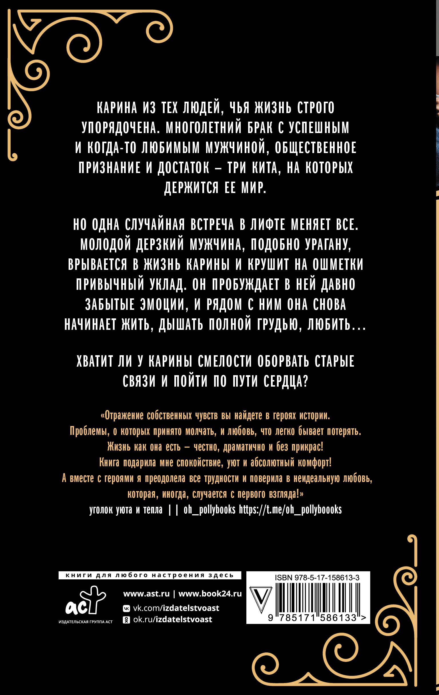 Многолетний брак с успешным и когда-то любимым мужчиной, общественное признание и достаток - три кита, которых держится ее мир. Но одна случайная встреча в лифте меняет все: молодой дерзкий мужчина, подобно урагану, врывается в жизнь Карины и рвет на ошметки привычный уклад, он пробуждает в ней давно забытые эмоции, и рядом с ним она снова начинает жить, дышать полной грудью, любить…| Издательство | Издательство "АСТ" |