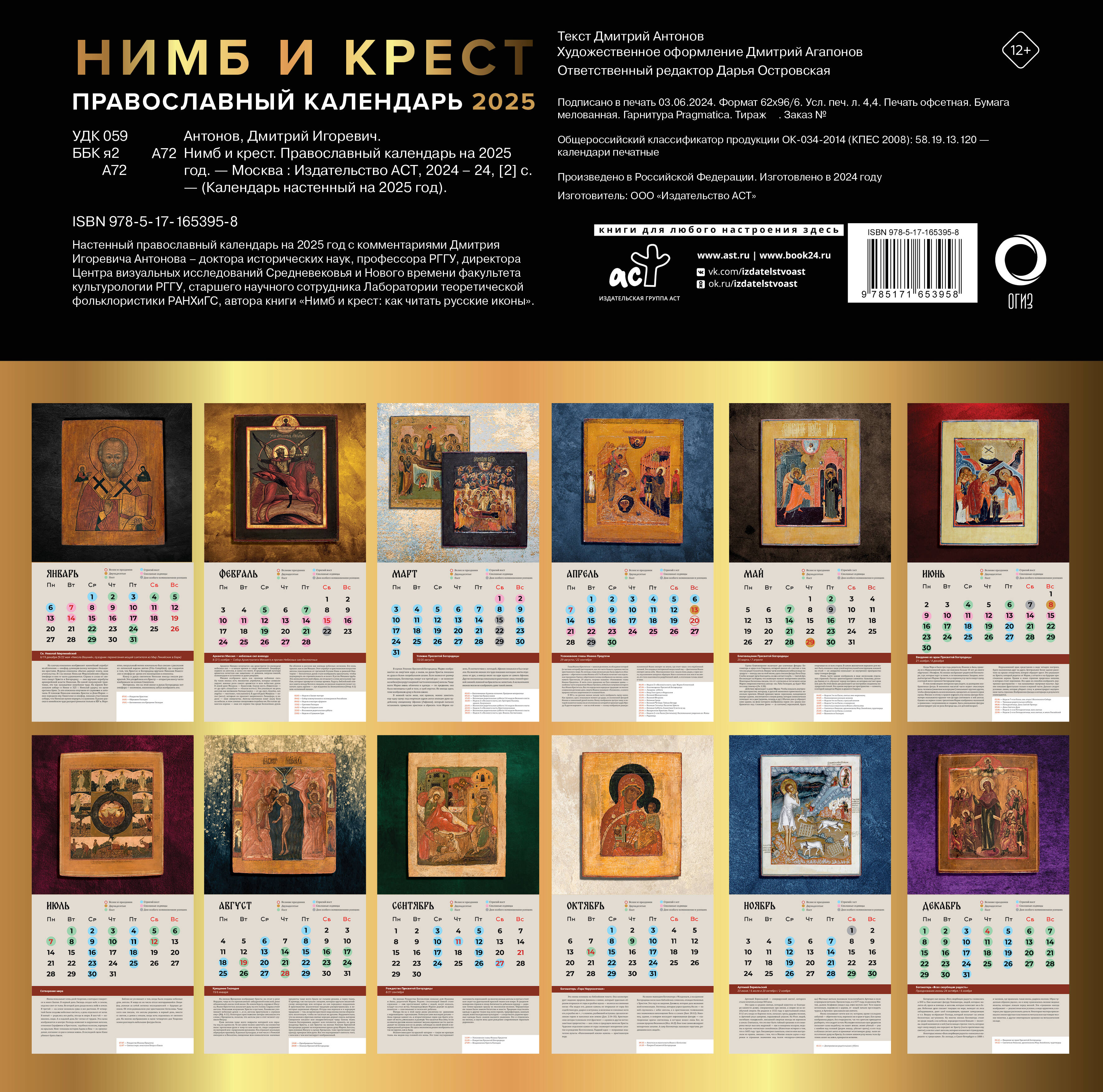 Настенный православный календарь на 2025 год с комментариями Дмитрия Игоревича Антонова - доктора исторических наук, профессора РГГУ, директора Центра визуальных исследований Средневековья и Нового времени факультета культурологии РГГУ, старшего научного сотрудника Лаборатории теоретической фольклористики РАНХиГС, автора книги "Нимб и крест: как читать русские иконы".| Издательство | Издательство "АСТ" |