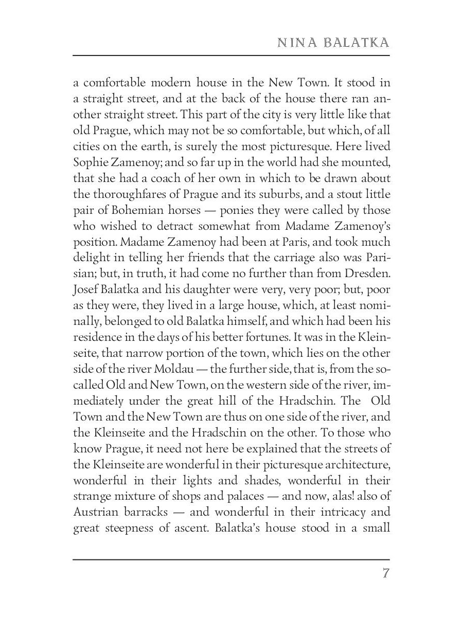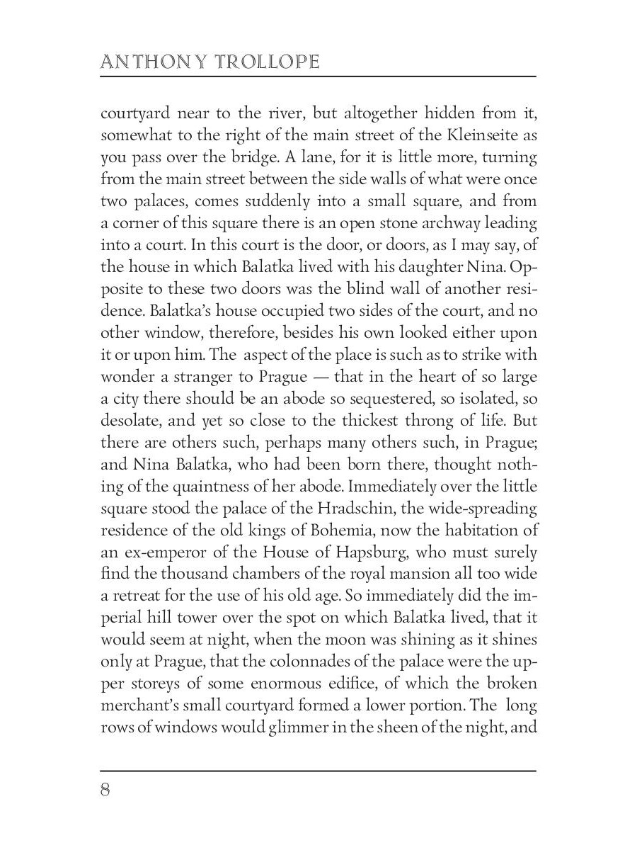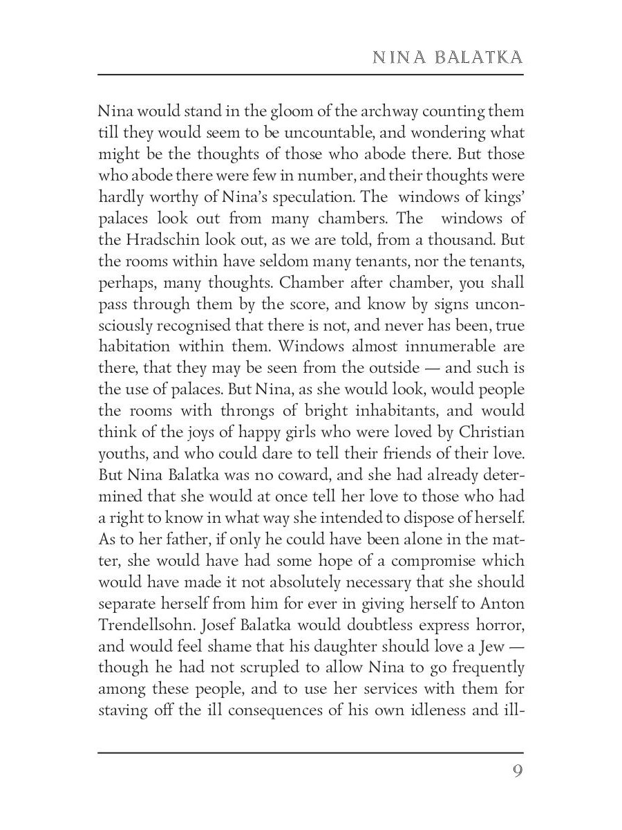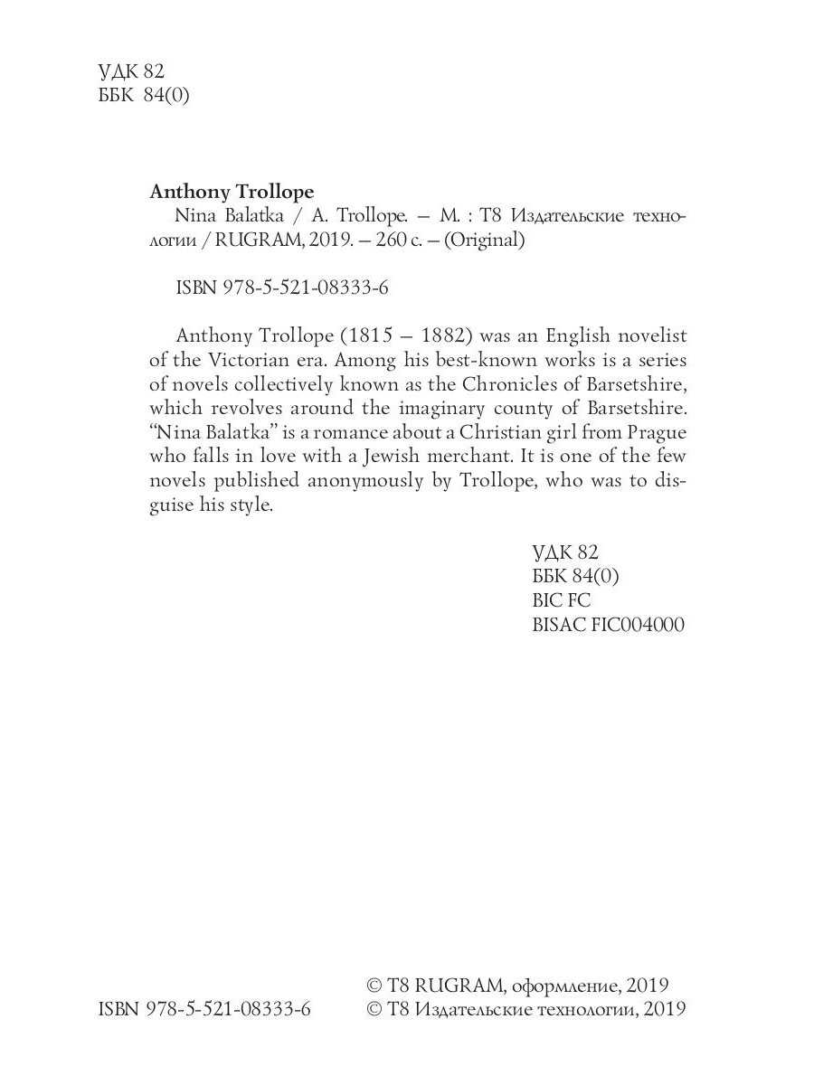 Anthony Trollope (1815 - 1882) was an English novelist of the Victorian era. Among his best-known works is a series of novels collectively known as the Chronicles of Barsetshire, which revolves around the imaginary county of Barsetshire. "Nina Balatka" is a romance about a Christian girl from Prague who falls in love with a Jewish merchant. It is one of the few novels published anonymously by Trollope, who was to disguise his style.| Издательство | Т8 RUGRAM |