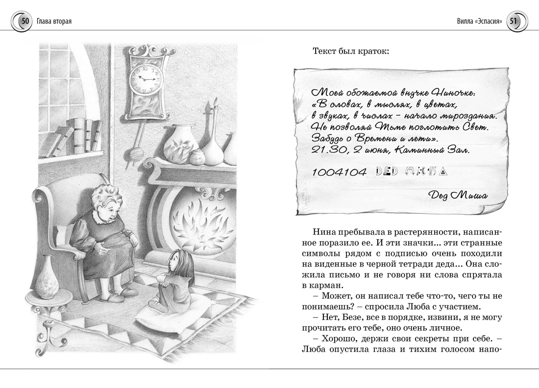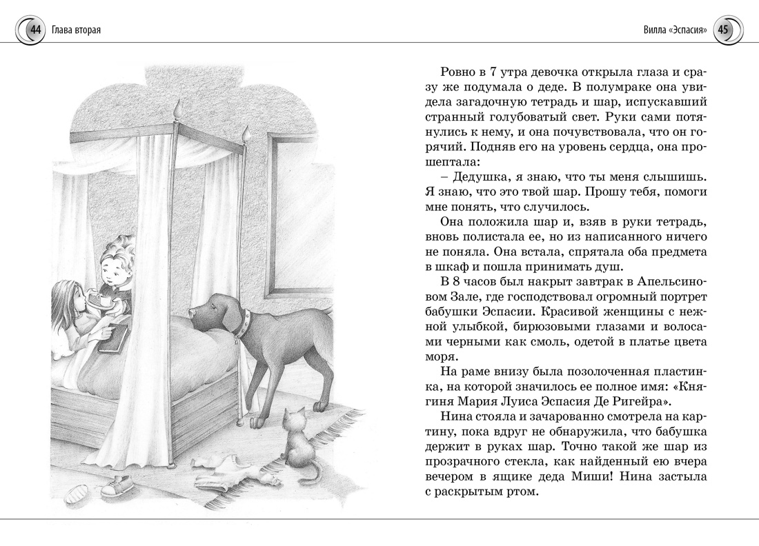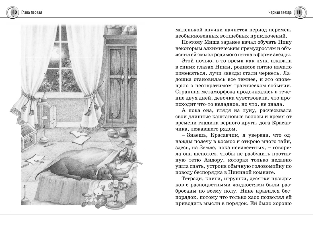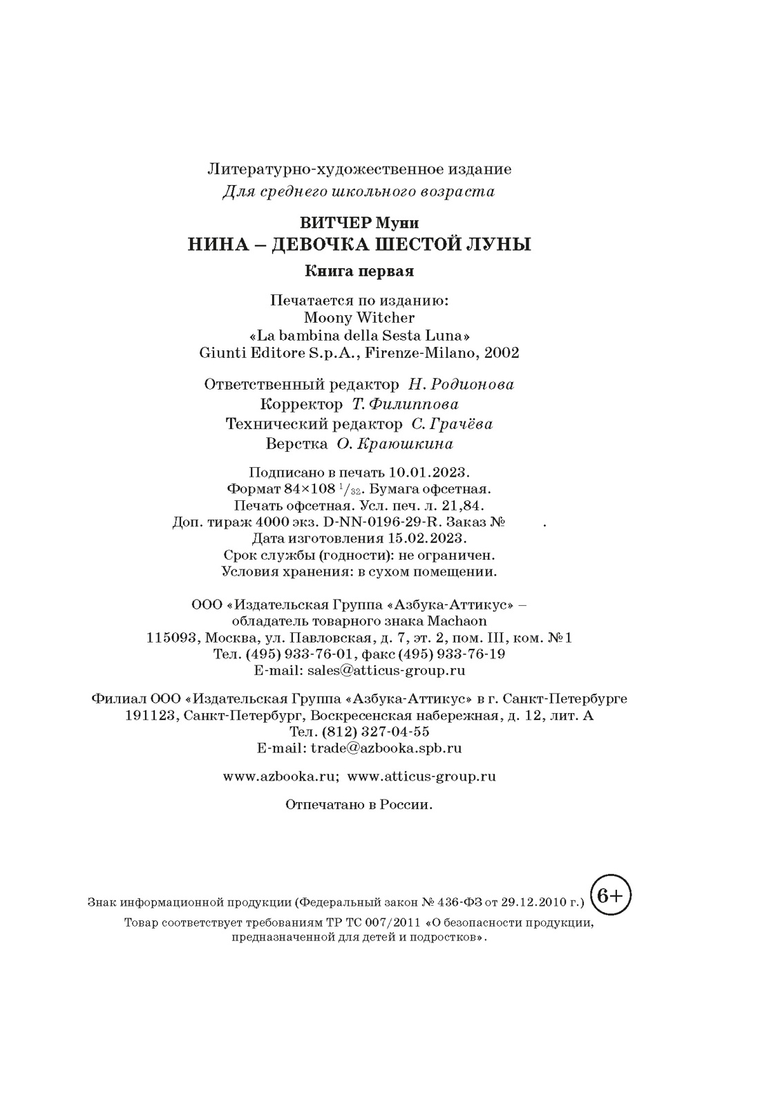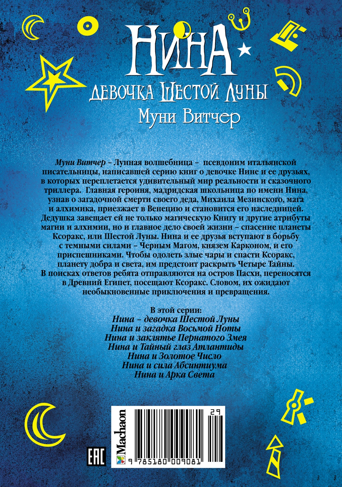 Никто не знает Мунни Витчер - Лунную Волшебницу, которая написала "Девочку Шестой Луны". Не знают - где она живет. Известно только, что у нее двенадцать кошек и две совы, которые помогают ей творить чудеса, готовить магические препараты и писать удивительные истории. Лунная Волшебница считает, что каждый ребенок может стать алхимиком-волшебником, достаточно только знать тайный алфавит, которым написаны заклинания в Книге волшебства, иметь богатую фантазию, терпение и любить животных. Главная героиня книг Лунной Волшебницы - девочка Нина, живет в Мадриде. Русское имя ей дал ее дедушка, Великий Маг и алхимик, который женился на испанской княгине Марии Луизе Эспасии де Ригейра и живет в Венеции. На ладони у Нины есть родимое пятнышко в форме звезды - знак великого алхимика. Именно оно сигнализирует о грозящей опасности. При загадочных обстоятельствах погибает дедушка Нины. И ее жизнь резко меняется. С помощью тайного алфавита алхимиков ей надо расшифровать записи дедушки и спасти Шестую Луну от коварного Князя зла Каркона. Для этого Нине придется превратиться в гнома, изготовить эликсир из зубов дракона, раскрыть тайну крылатого льва с площади святого Марка в Венеции, перенестись на другую планету, побывать на острове Пасхи, в Древнем Египте и на пирамидах Мексики… Их ожидают необычайные приключения! Это не просто книга со множеством приключений и чудес. Одновременно она может стать для ребенка увлекательной игрой. Ведь для того, чтобы понять заклинания, написанные в книге, необходимо воспользоваться тайным алфавитом. С помощью этого алфавита можно отгадать магическую фразу, зашифрованную в книге.| Издательство | Махаон |