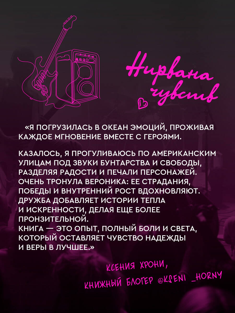 Ее внешний вид - гранж. Ее друзья - панк. Ее душа - хеви-метал. Веронику бросают по смс, над ней висят выпускные экзамены, ее лучшие друзья ввязываются в сомнительные авантюры, а атмосфера в рок-группе накалена как никогда прежде. И среди этого хаоса только новый знакомый Итан Хьюз - соло-гитарист, улыбка которого способна залечить ее сердце, - помогает держаться на плаву. Погружаясь в мир большой музыки, Вероника оказывается под пристальным вниманием. Сможет ли юная бас-гитаристка выдержать эту качку под душераздирающий рев гитар и оглушительные удары разбитого сердца?| Издательство | Издательство "АСТ" |